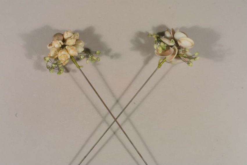 Pair of matching hatpins with crescent shaped Roman pearl heads, one smaller crescent and three round pearls suspended from chains are attached at top of head and at shaft.