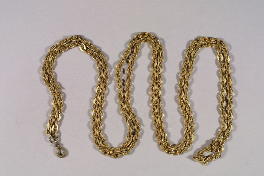 Gold oval and twisted wire link watch chain with hook and clip attachments.