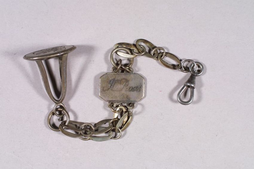 Silver watch chain with rectangular plaque engraved "H Rust," silver seal fob attached engraved "HR."
