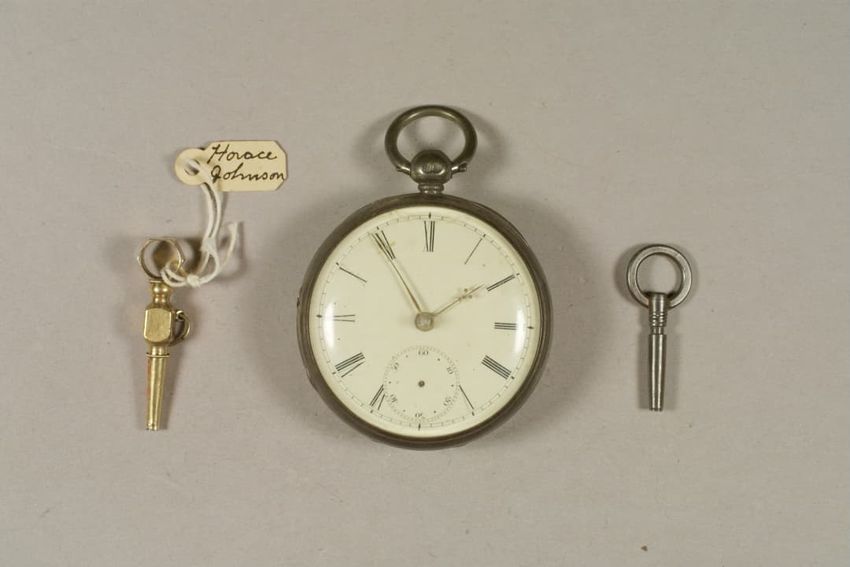 silver pocket watch with silver key. White watch face with Roman numerals under glass. Opens in back to original label of owner "Horace Johnson Manchester NH" entire watch comes out when opened.