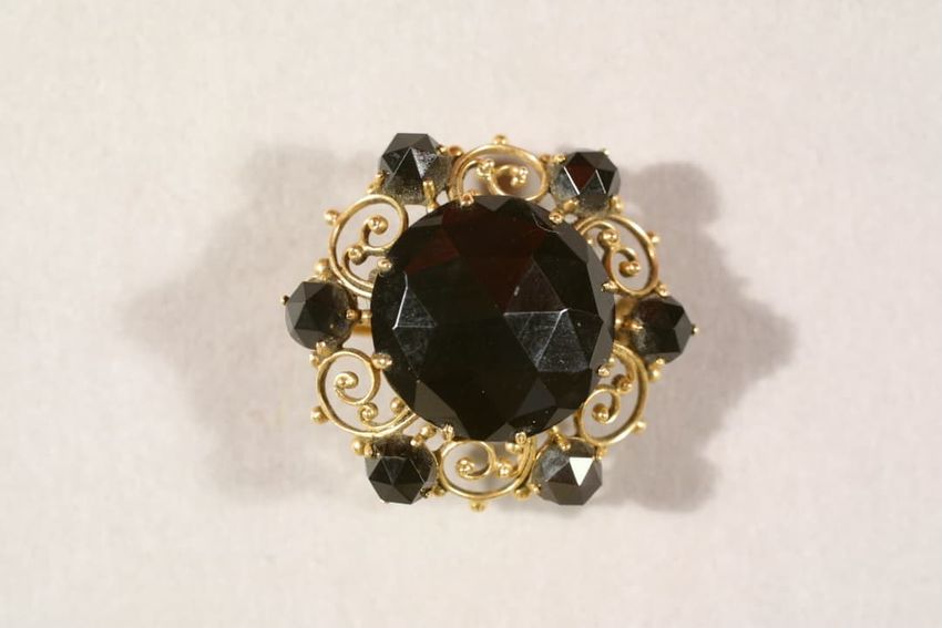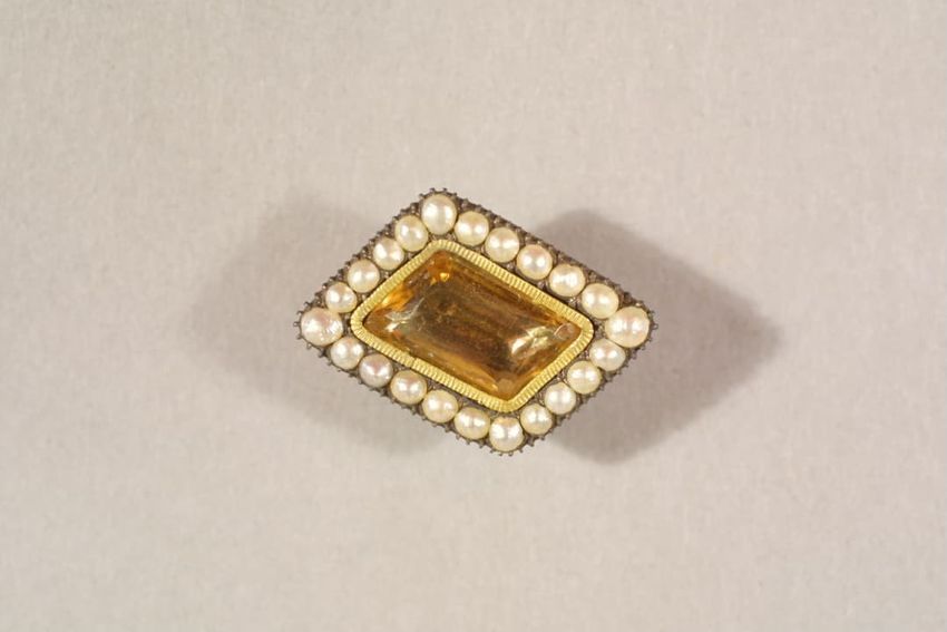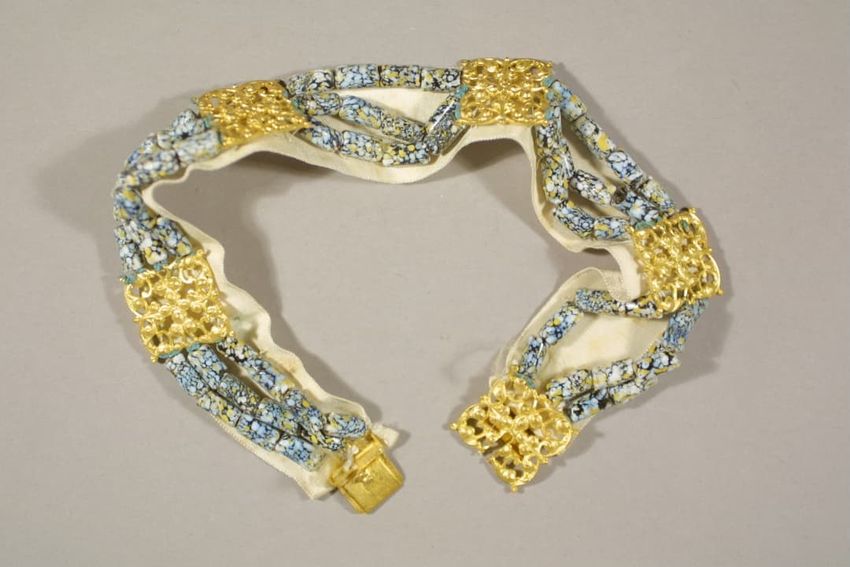gold (metal), topaz (mineral), sapphire (mineral), enamel (fused coating)
