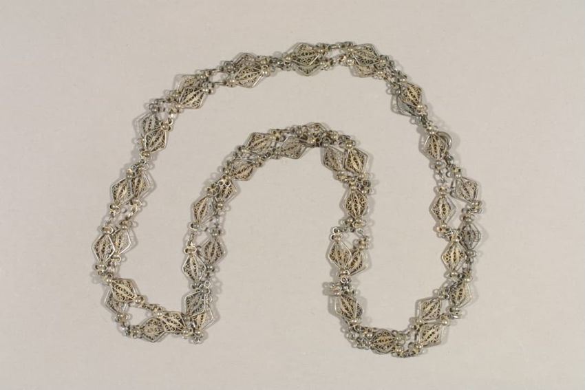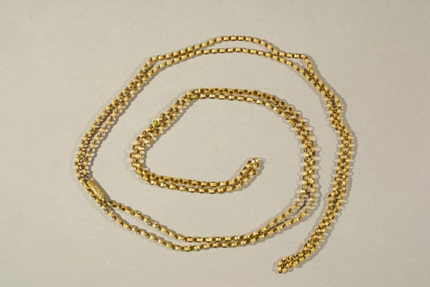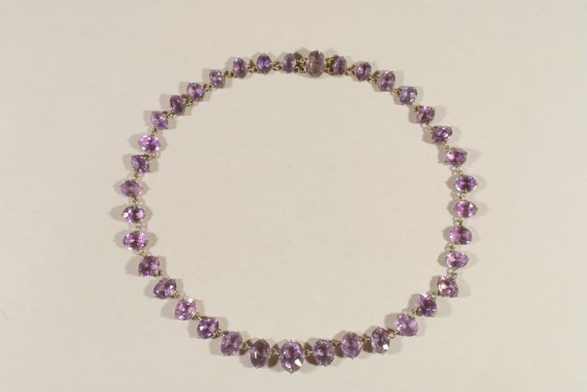 Gold necklace with ten emerald-cut, rectangular topazes, each in an open-backed bezel setting alternating with open-work plaques of gold decorated with rococo swirls and enamel in red, green and blue set with small round cabochon sapphires in the center of each. The necklace closes with a thumb-ring...