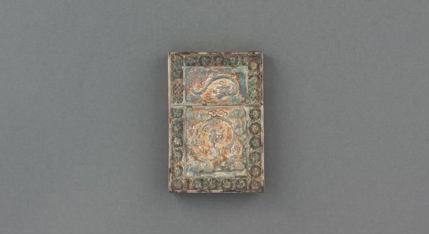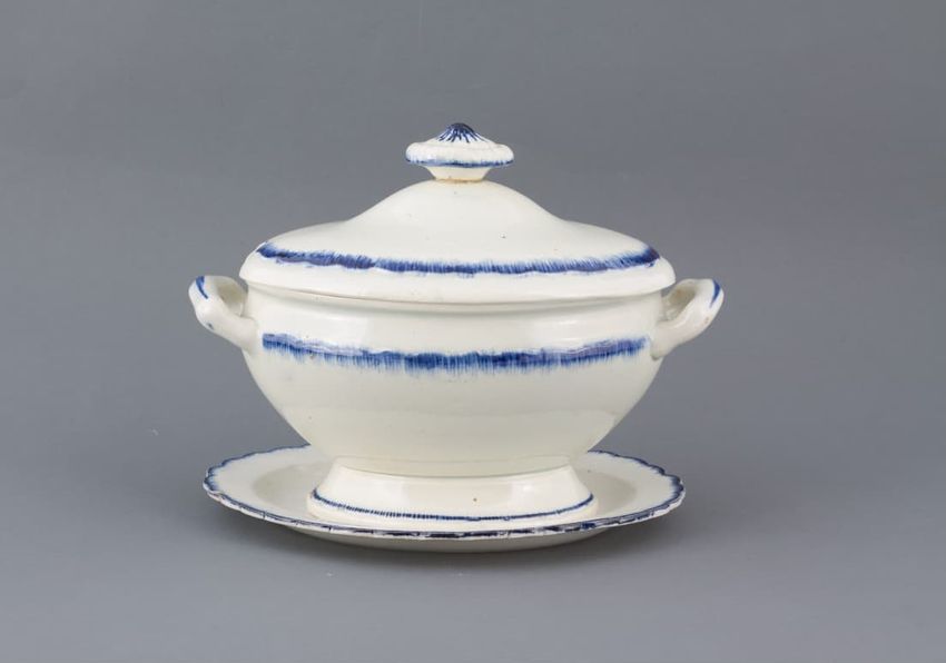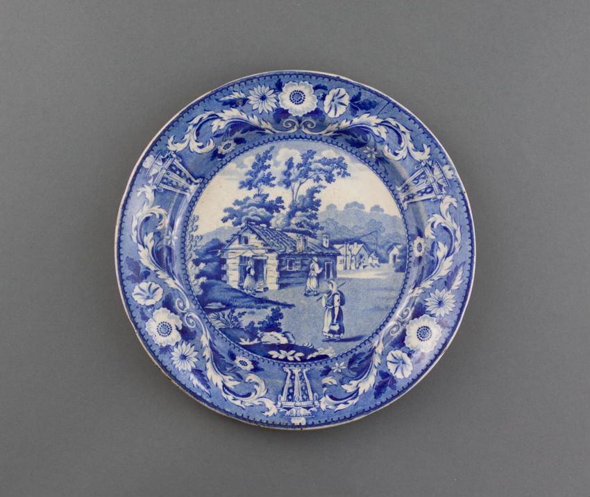 Earthenware children's mug. Brown transfer printed scene with three figures, two boys and a girl. One boy is seated at right, holding his hat out in front of him. The girl, at left, appears to be handing scissors to the boy at center. Scene is framed by large flowers. Over painted with blue, gr...