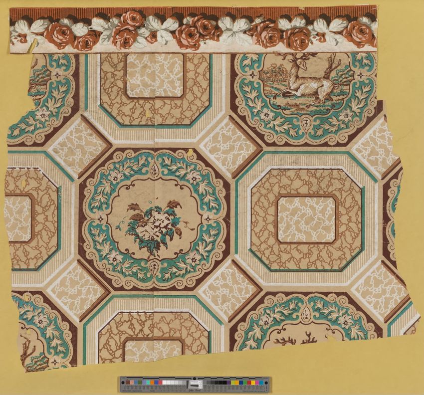 Partial roll of wallpaper border. Continuous row of tulips, daffodils and peonies, bordered above and below by brattishing. Printed in two greens, two blues, pink, red, yellow and white.
