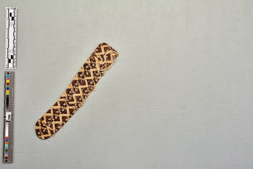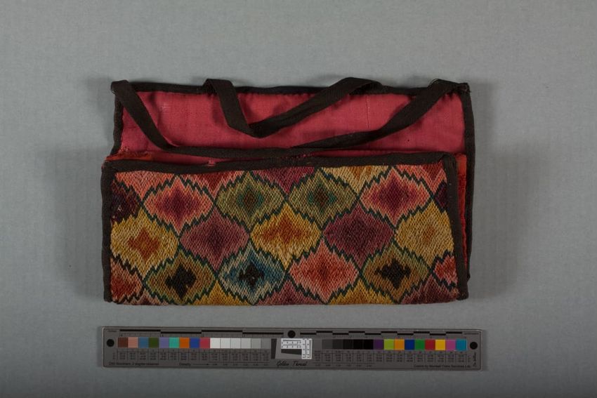 Flamestitch in diamond pattern in reds, greens, purples, yellows, blues outlined in green vegetable dyes; two pockets lined with pink glazed wool; black tape at edges with two loops for tying - but longest tape to wrap around is missing.