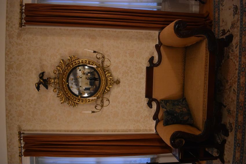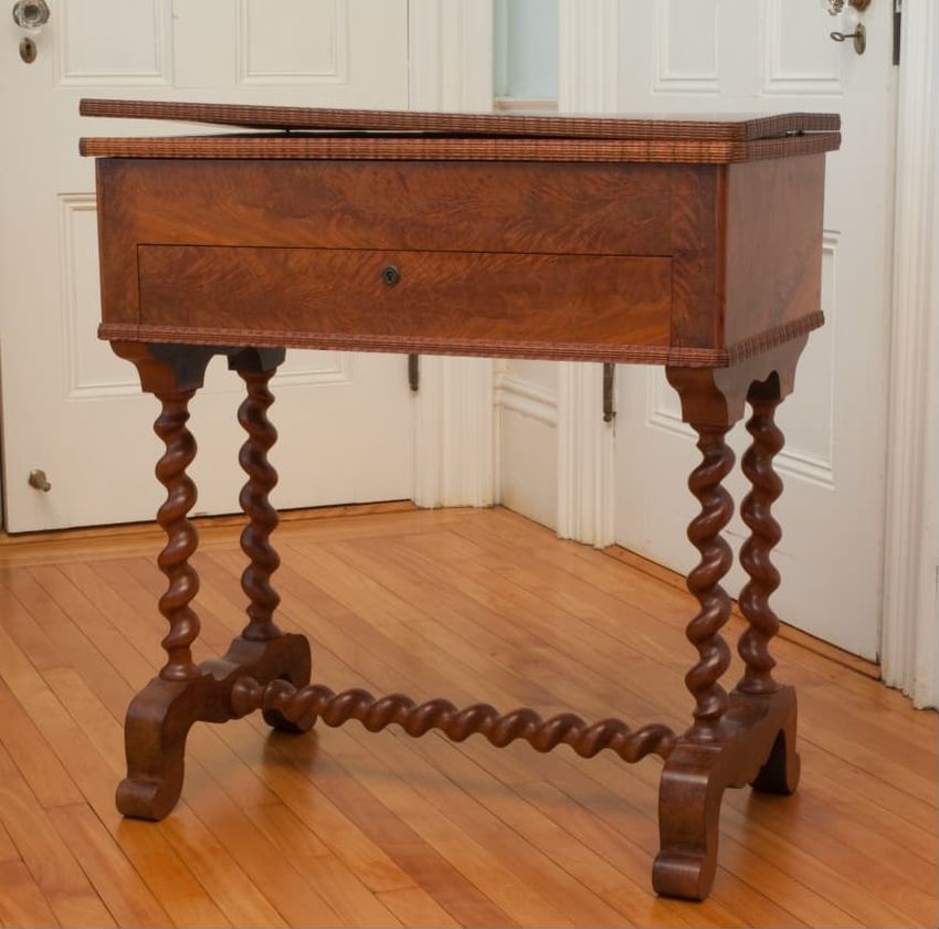 Two-piece pale blue silk and white machine lace dress with Venetian lace accents at neck and collar. High lace collar, flowing collar points, pointed basque, puffed sleeves, elbow cuffs. Gored skirt with solid silk underskirt and lace inset overskirt. Heart-patterned machined flat lace.