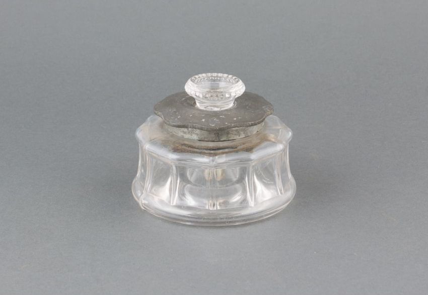 oval body with bridge spout and scrolled ear-shaped handle; kinked ends of knob; white body with black printed scene of woman in Empire dress with child on recamir sofa.