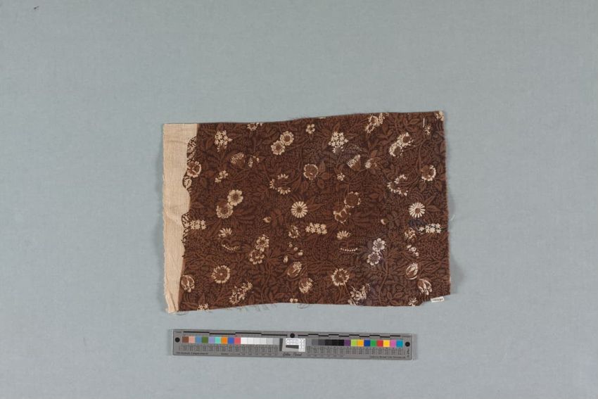 Brown and white printed fabric fragment.