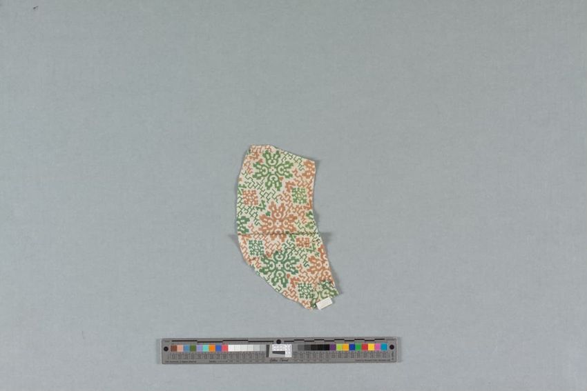 Red, yellow, and green printed cloth fragment.