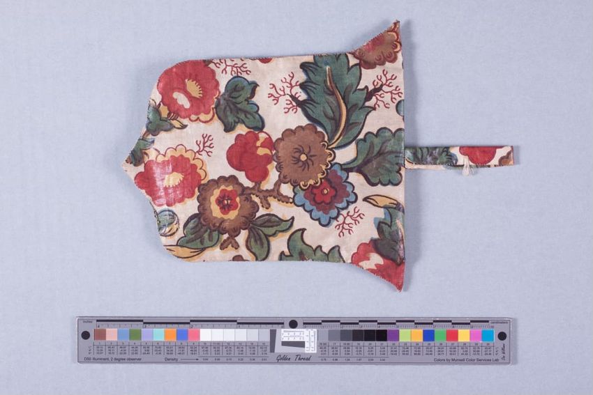 Overdress has cream ground block printed with multicolor floral and strawberry pattern enclosed by trailing black vine in ogee pattern. Neckline pointed at back with front tie closure; Empire waist bodice lined with linen, over printed green. Elbow length fitted sleeves; Front opening hem trimmed wi...