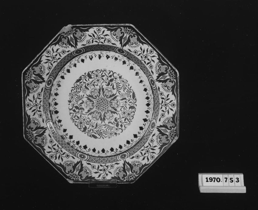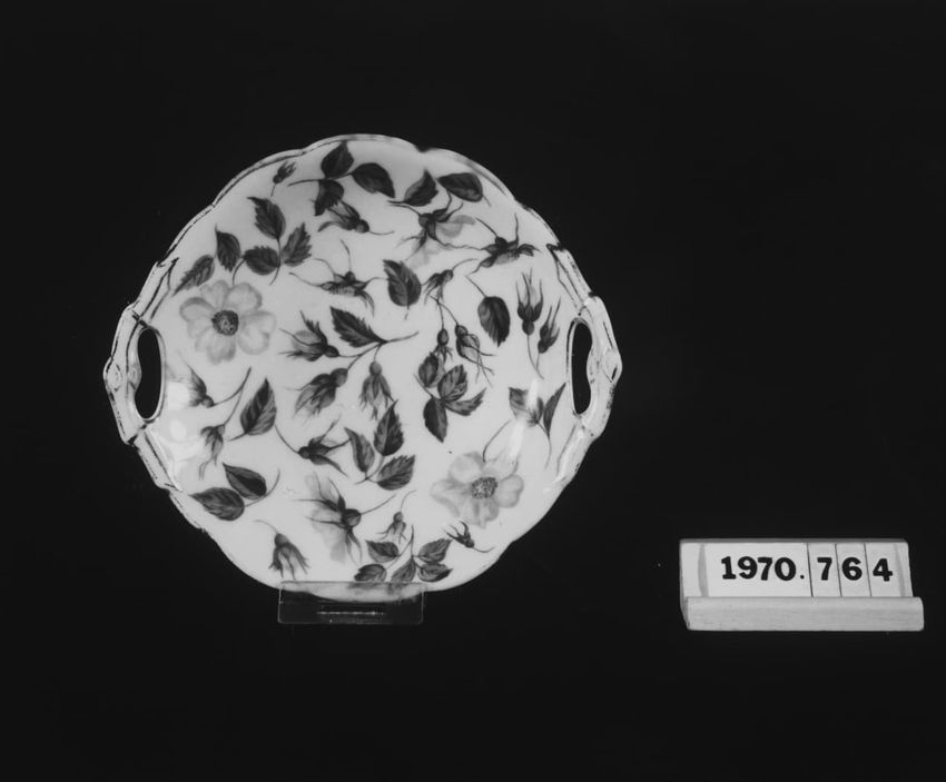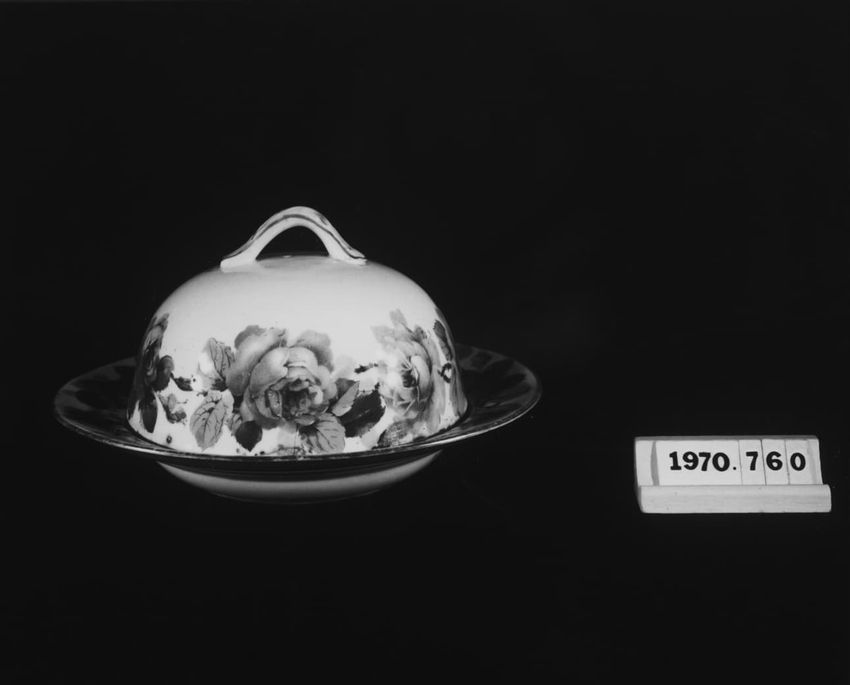 Trunk. Leather, pine, iron, brass, linen. Rectangular in shape; straight sides; flat, hinged top covered in black leather; black; iron strips and latch. Leather handle secured by four brass tacks. White stitching on edges of trunk. Interior covered with linen material. Exterior bottom covered ...