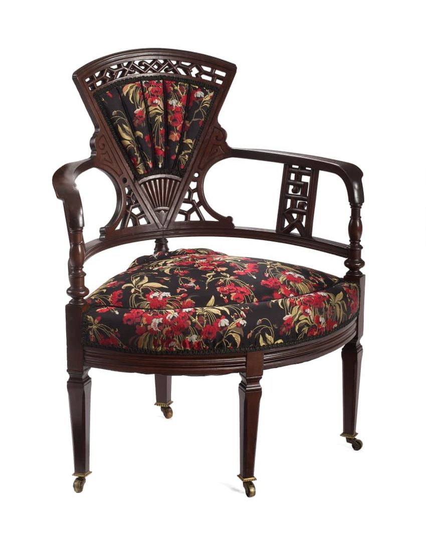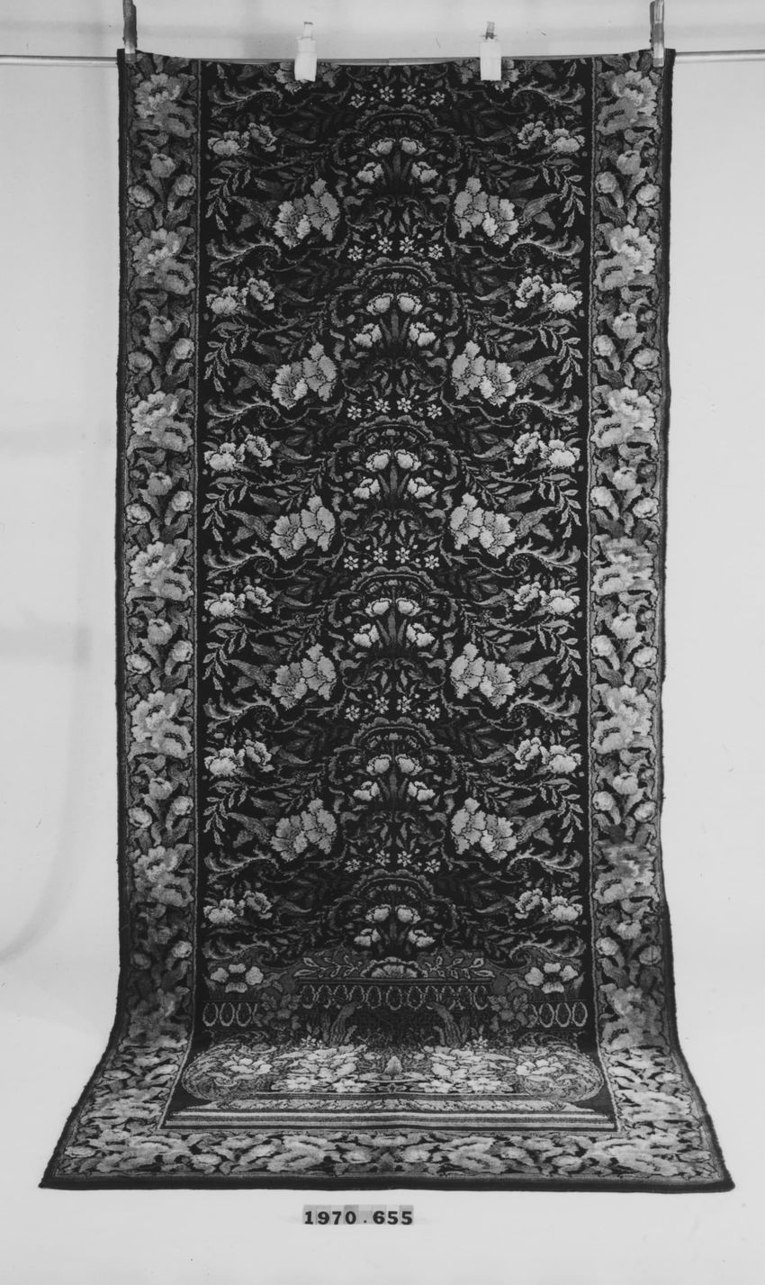 Machine woven pile, maroon, brown, and gold predominating. Elongated symmetrical panel of stylized meandering floral vine repeating vertically and emanating from a stepped pedestal base with similar stylized floral motif. Maroon ground. Border is large stylized blossoms on back ground with secondary...