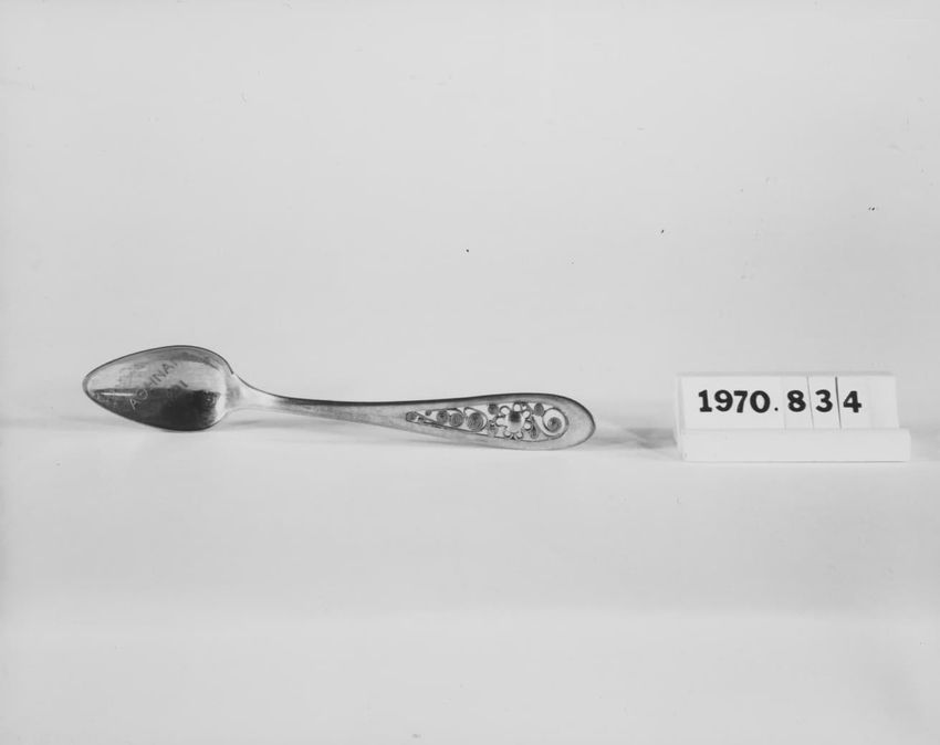 Silver colored body. Cast decoration. A) bulbous circular body with ribbed effect at base; circular foot. Shaped spouted mouth with scrolled relief decoration at edge. Similar decorated C-shaped handle. Conforming hinged lid with elaborate thumb piece or spur with leafy terminus. Marked (globe) MFT...