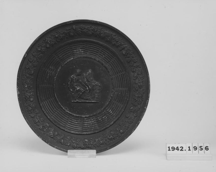Green; circular, shallow well; molded floral and basket border; classical figure