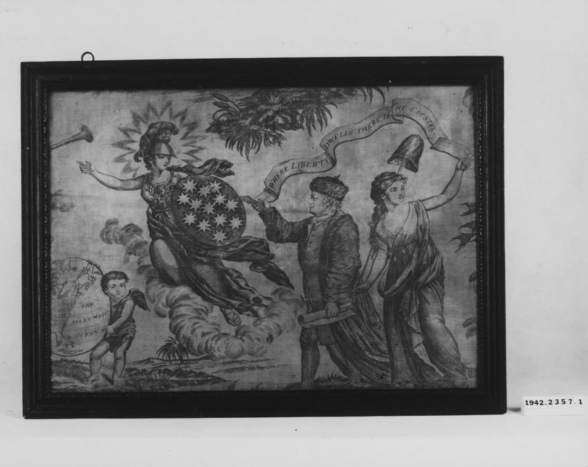 Framed partial panel of toile de Jouy "The Apotheosis of Washington and Frankling" Copperplated line and cotton, red on white. Depicts Lady Liberty escorting two cherubs who are holding North America in their hands with Benjamin Franklin following and a female figure in a liberty cap. They are bring...