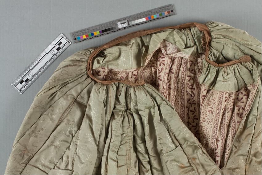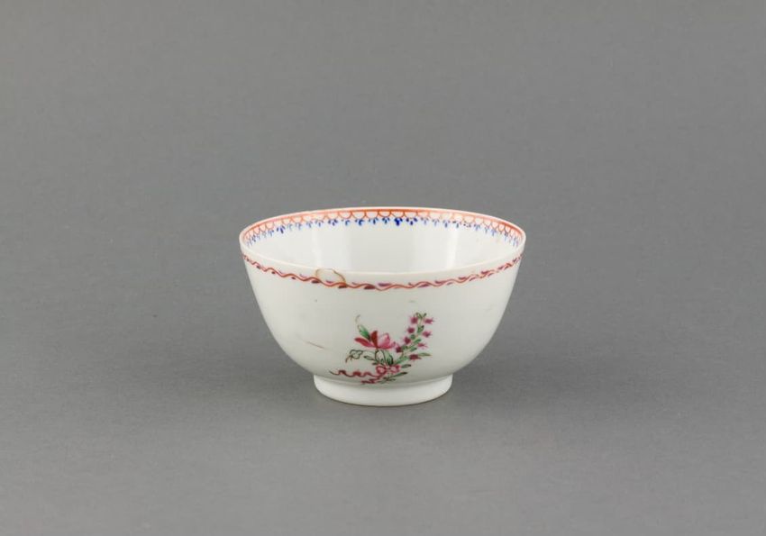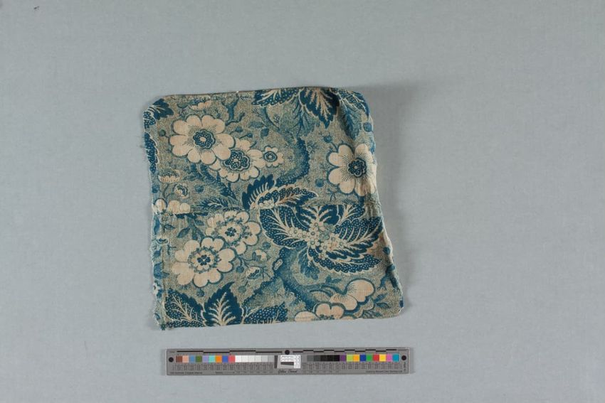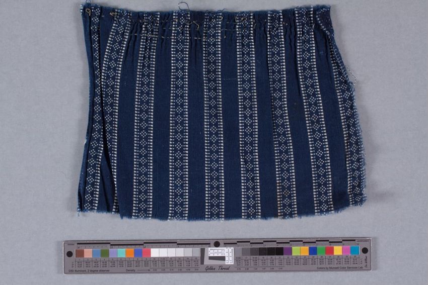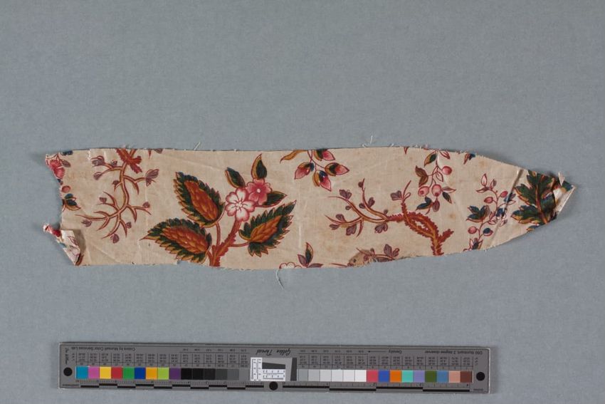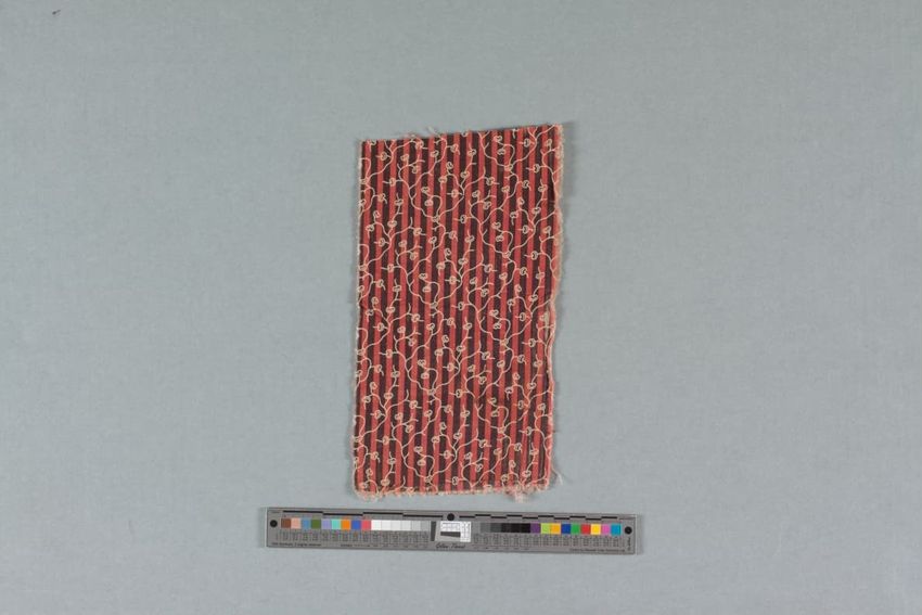 Red with leather strap closure, tan lining, embossed garland border inside, 2 compartments, pencil holder, lined with blue and white marbled paper.