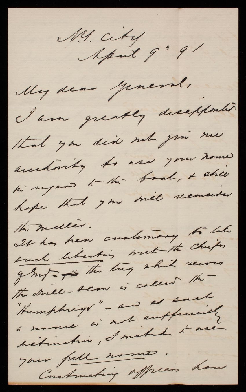 [George Lewis Gillespie Jr.] to Thomas Lincoln Casey, April 9, 1891