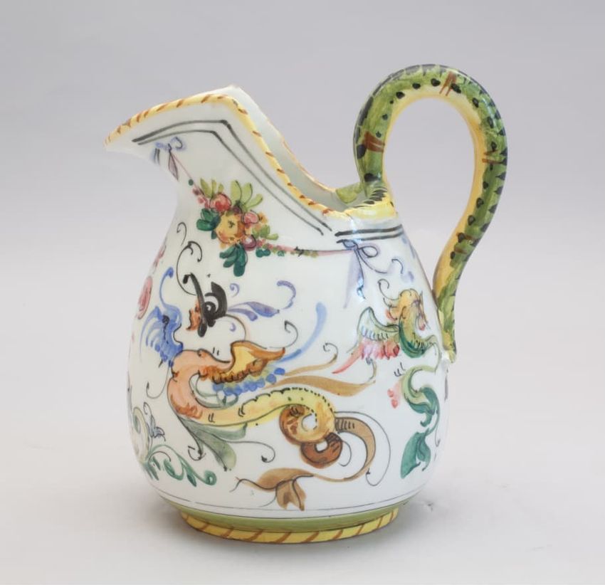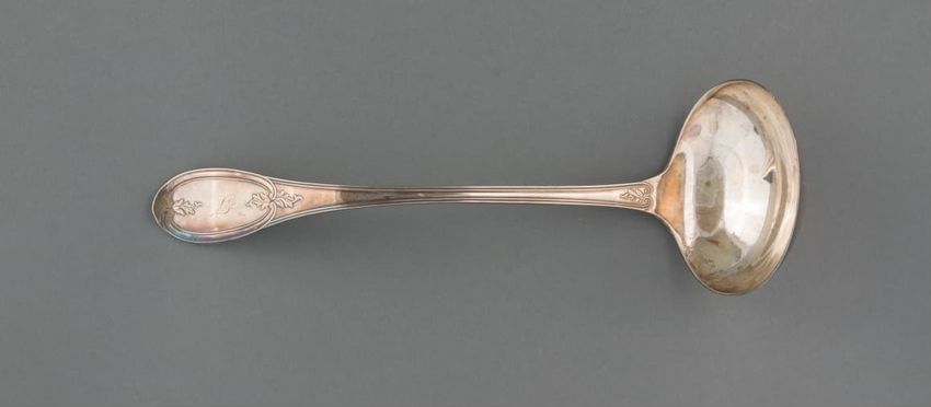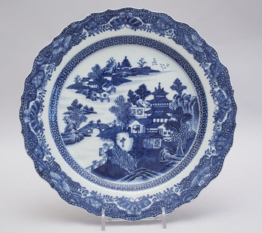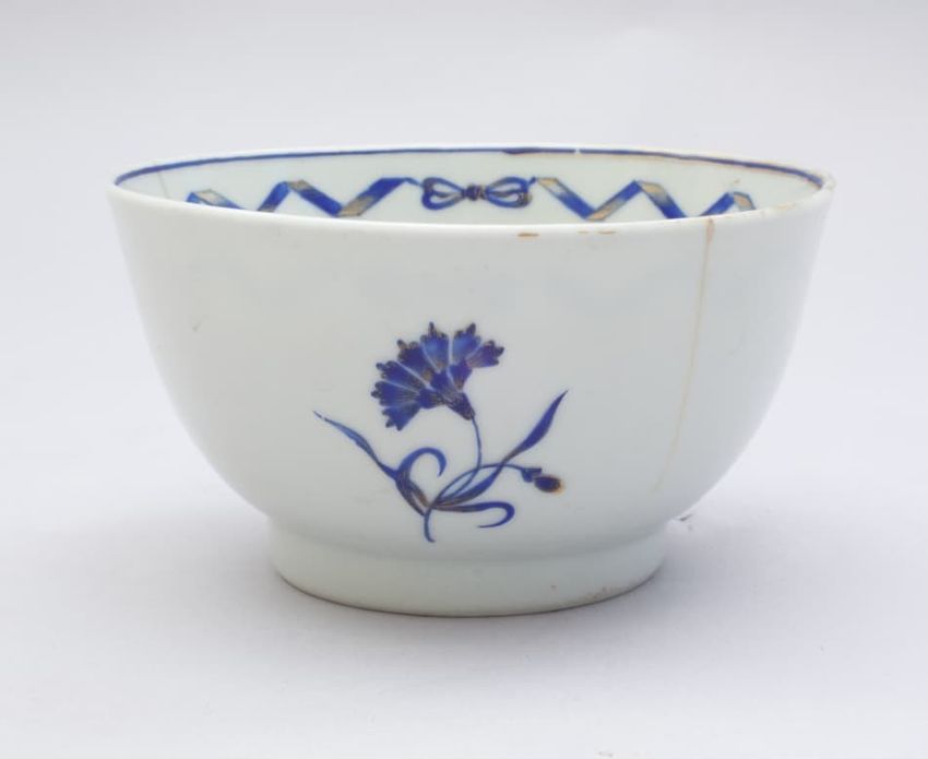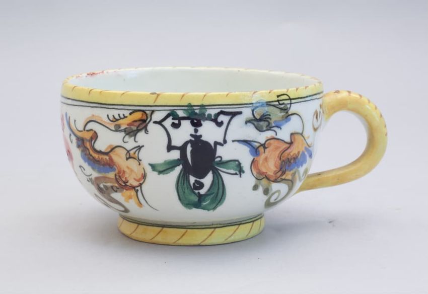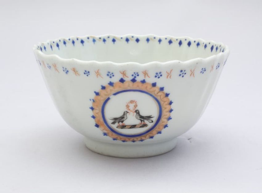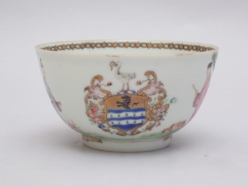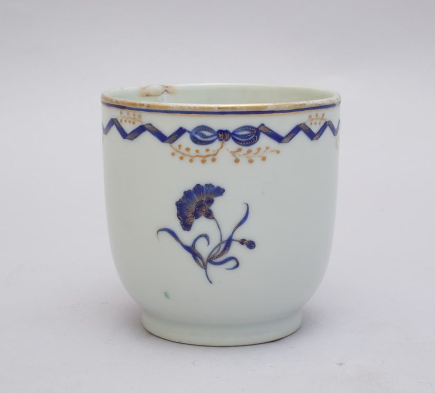 Armorial porcelain handleless teacup with foot ring. White body with blue, gold and black painted decoration of a shield with a gold monogram "EMJ", above is an animal face between two wings, all framed by gold and blue cloth swags with tassels, alternating blue and gold diamonds around outer rim an...