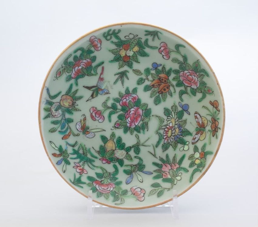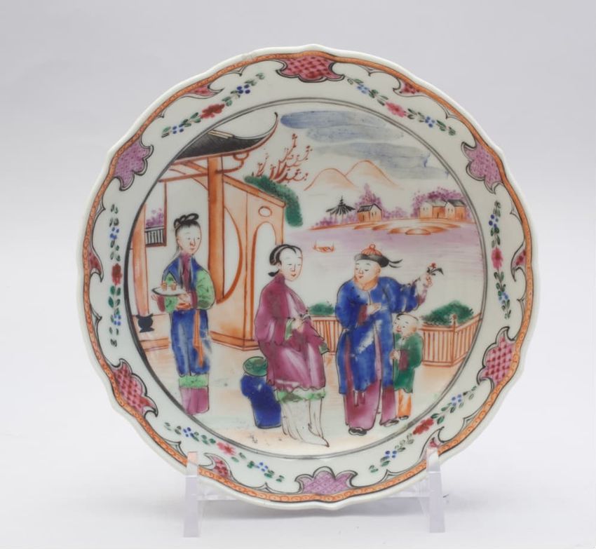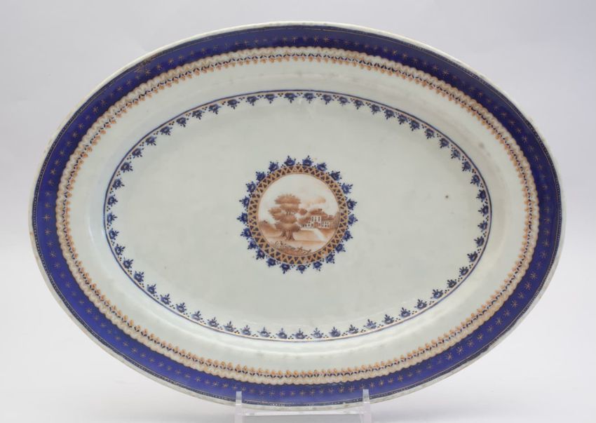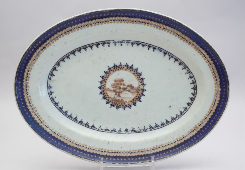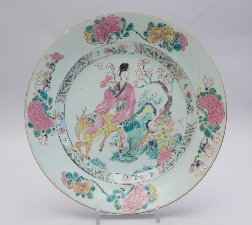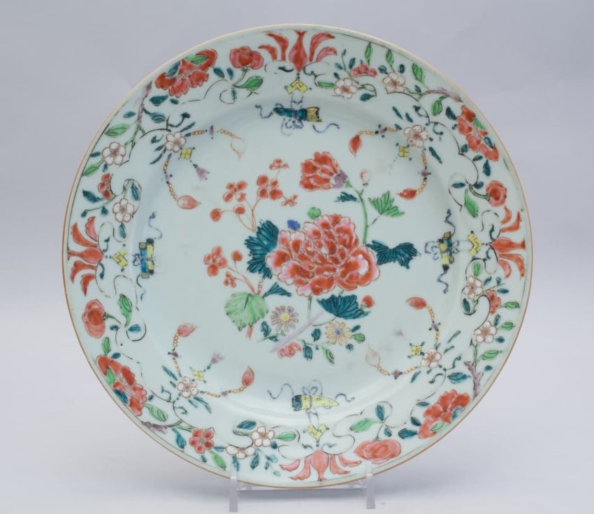 Armorial porcelain dinner plate with painted polychrome decoration with a central design of two peacocks and flowers framed by a trefoil border. Coat of arms at top of rim consiting of a shield with three sheaves of whteat, three flower branches and birds along sides and bottom of rim and gold diape...