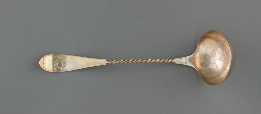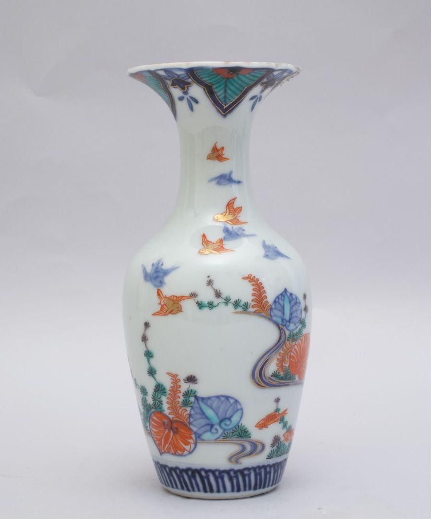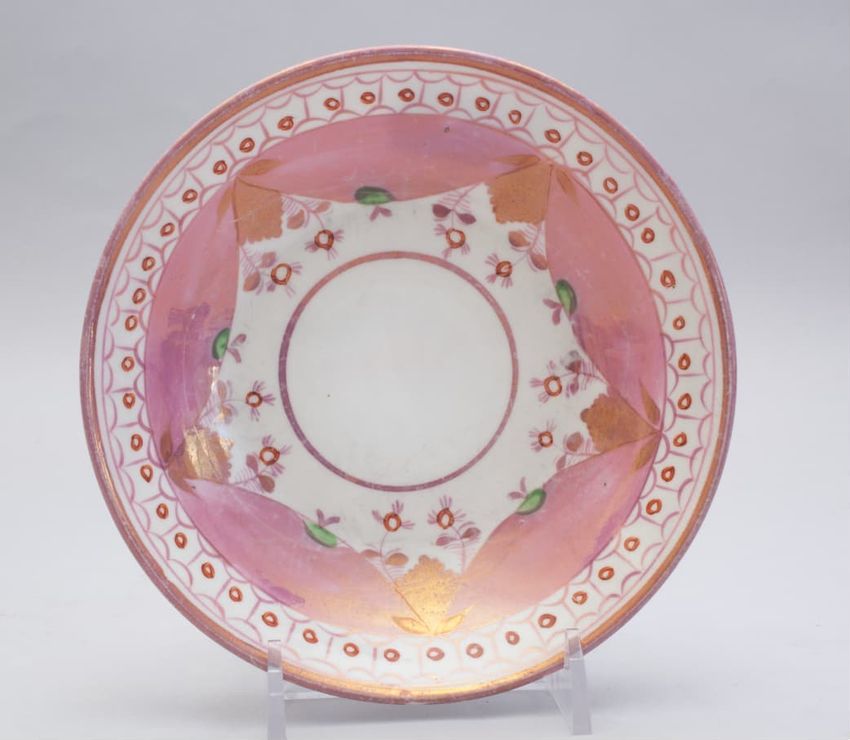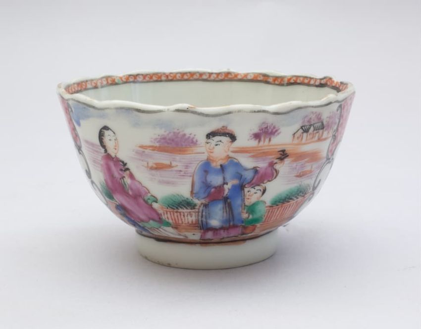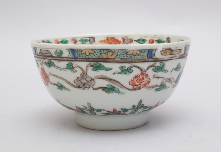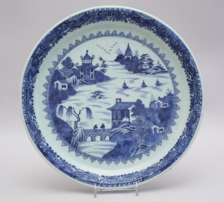 Armorial porcelain dinner plate with painted polychrome decoration with a central design of two peacocks and flowers framed by a trefoil border. Coat of arms at top of rim consiting of a shield with three sheaves of whteat, three flower branches and birds along sides and bottom of rim and gold diape...
