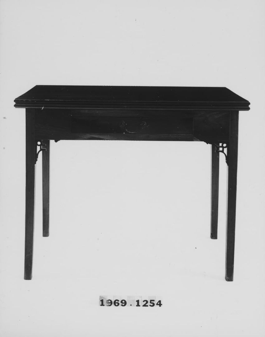 Card table with rectangular hinged top. Four straight legs, one leg swings out to support leaf. Table has pierced brackets and one drawer.