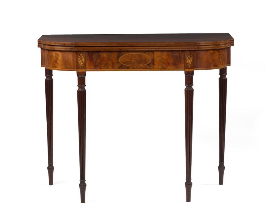 One of a pair of eastern Massachusetts card tables. Mahogany and exotic wood veneers. Lightwood stringing inlay on apron and edge of top; light and darkwood inlaid thistle paterae, lightwood inlaid oval at center of skirt. Astragal corners. Rests on four tapered fluted legs with arrow feet.