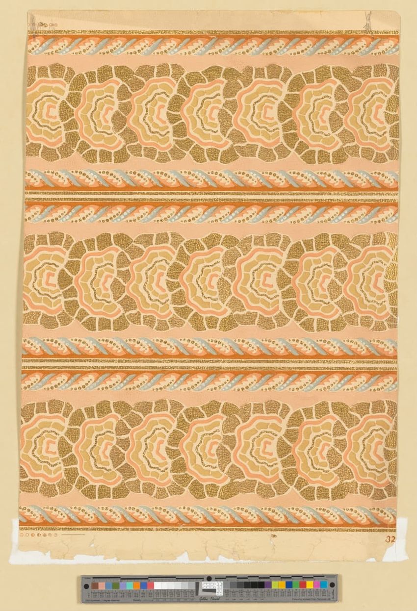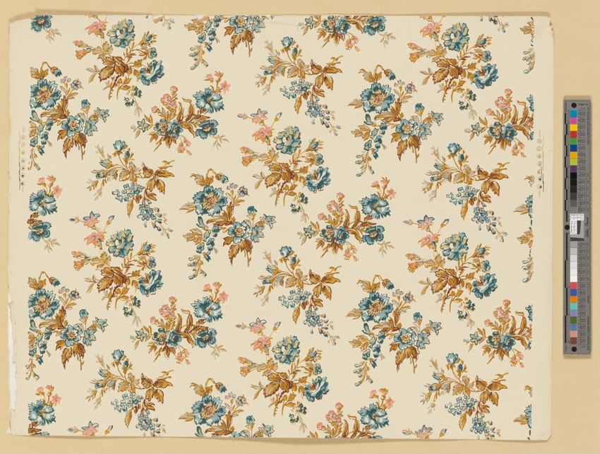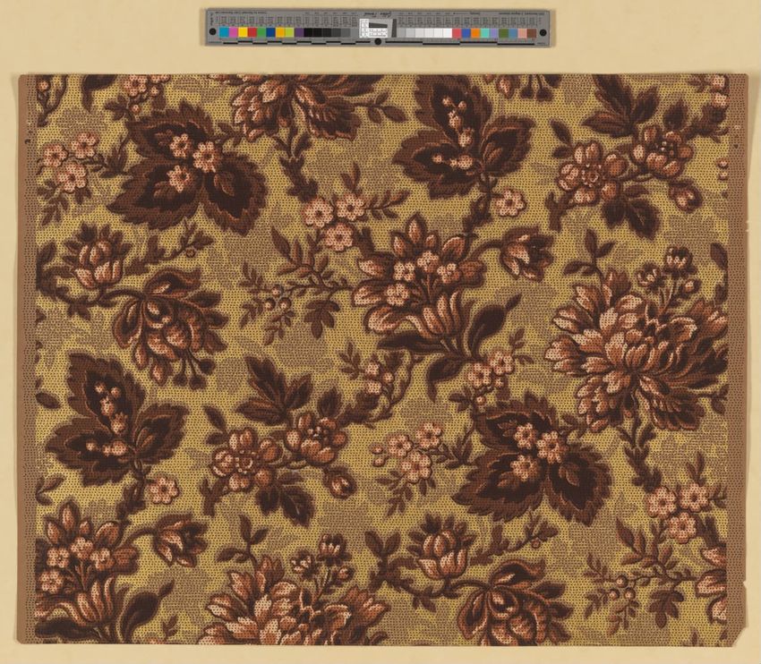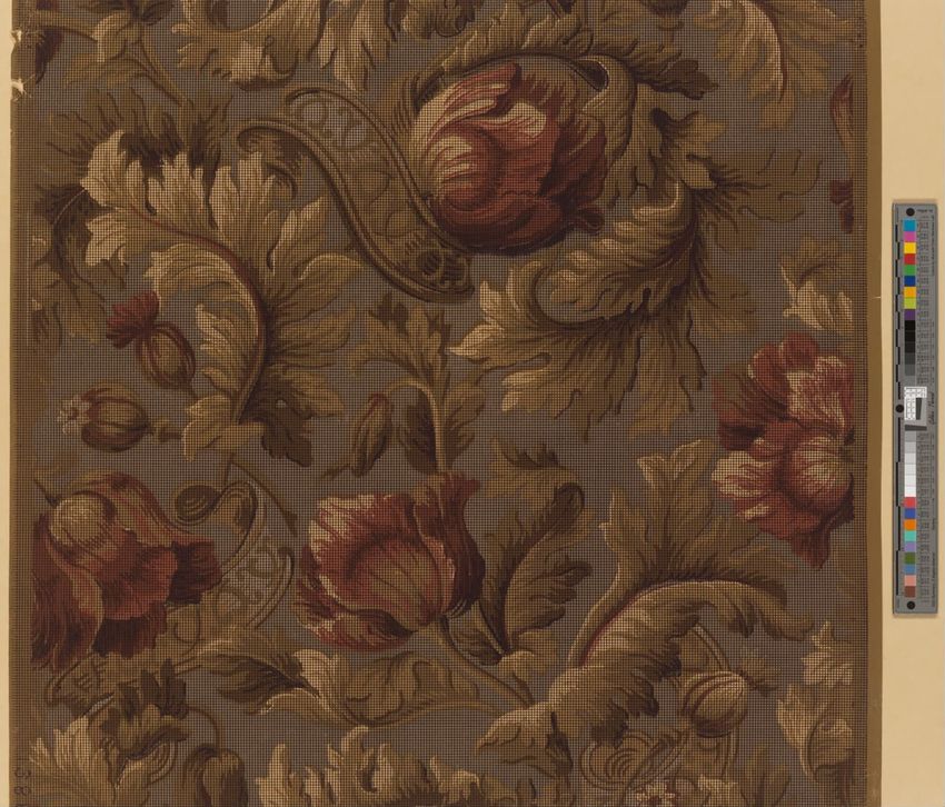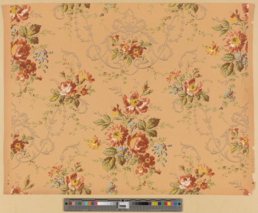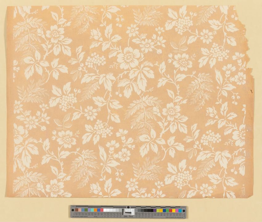 Two unused fragments of scenic paper, possibly lagoon or swamp. Foreground consists of myriad of foliage and flowers, including roses, behind which is water, water lilies, dragonfly, reeds, and trees. Printed in two greens, ten browns, red, pink, and grey on light grey ground.
