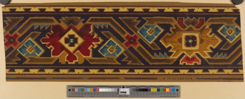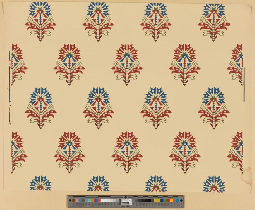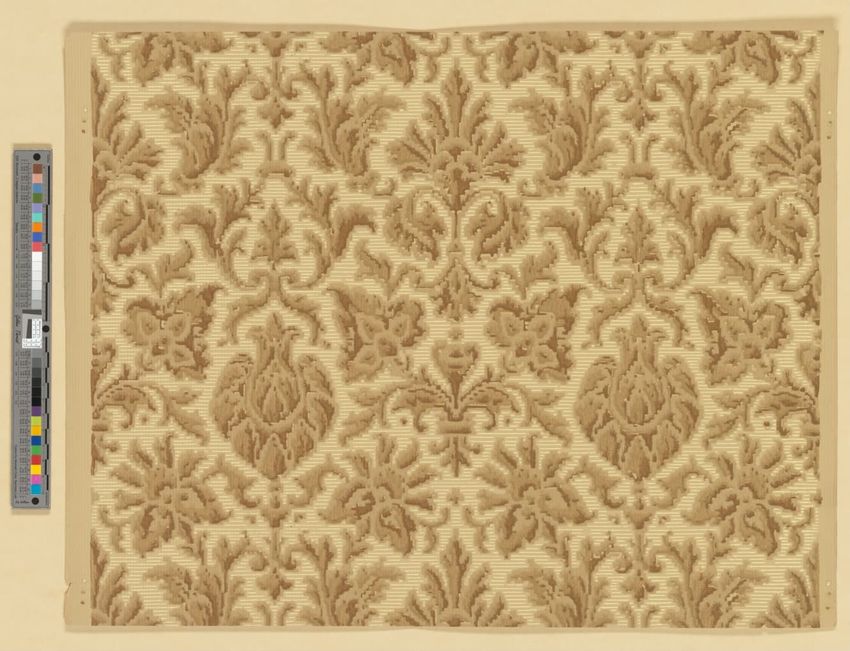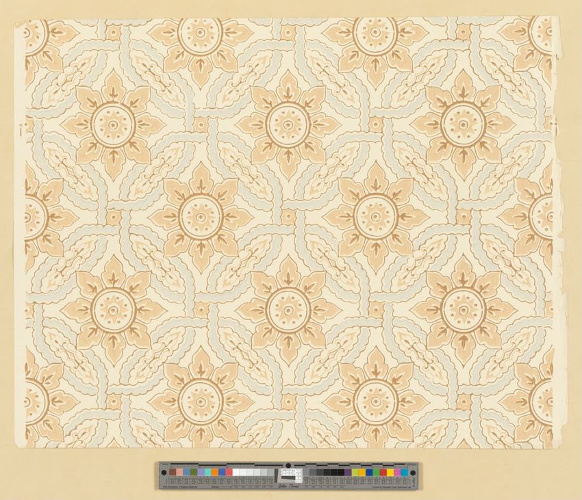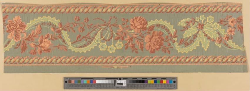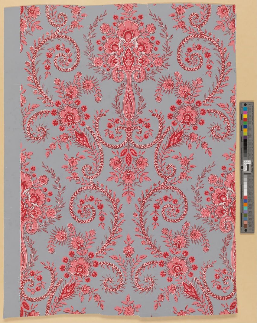 Two unused fragments of scenic paper, possibly lagoon or swamp. Foreground consists of myriad of foliage and flowers, including roses, behind which is water, water lilies, dragonfly, reeds, and trees. Printed in two greens, ten browns, red, pink, and grey on light grey ground.