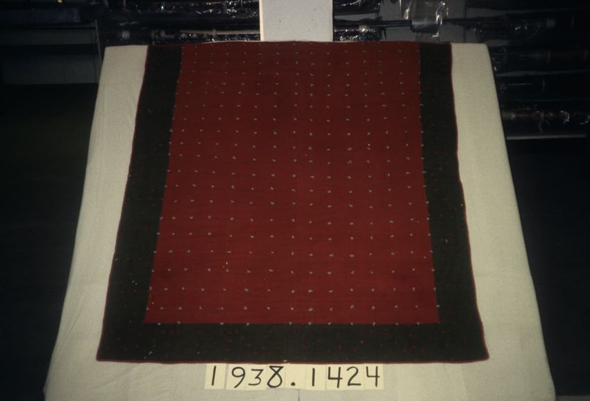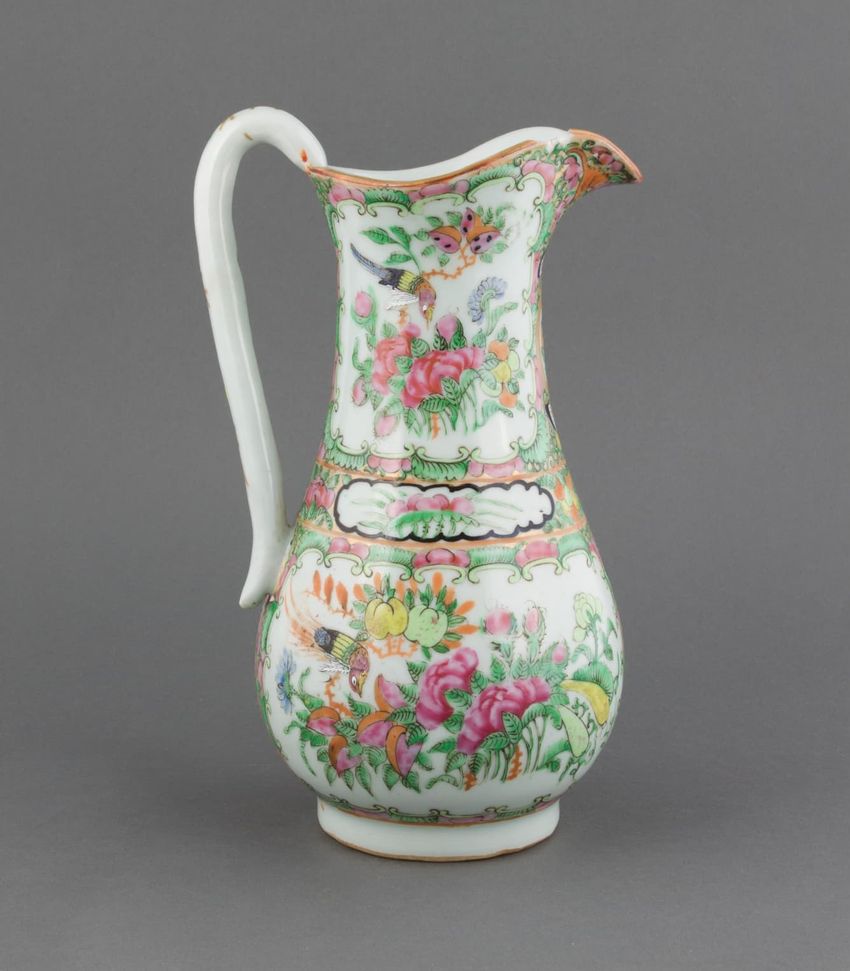 Enameled porcelain mug with twisted cord handle. Two square, scroll-edged medallions on either side of mug. One medallion depicts flowers, bird and butterfly. The other medallion, a scene with two male and two female figures. Opposite the handle, is a round medallion with flower and bird. Surround...
