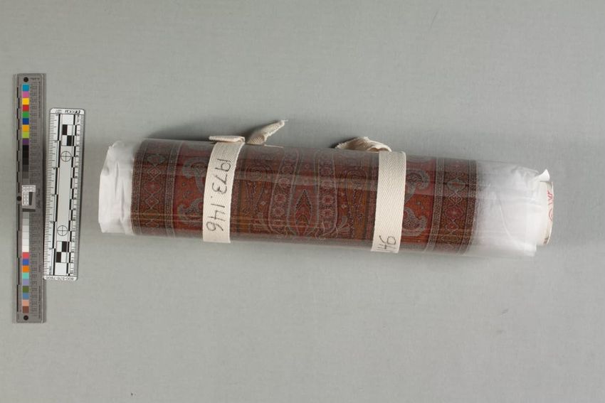 Alphabet/Verse sampler. Large scale geometric/ floral border, vertical rectangle, natural linen ground. Alphabets at top, verse at center, potted flowers below. Alphabets: #1-complete; #2- "A-W", missing "J"; #3-missing "J"; #4-complete; Numbers: "1-13".