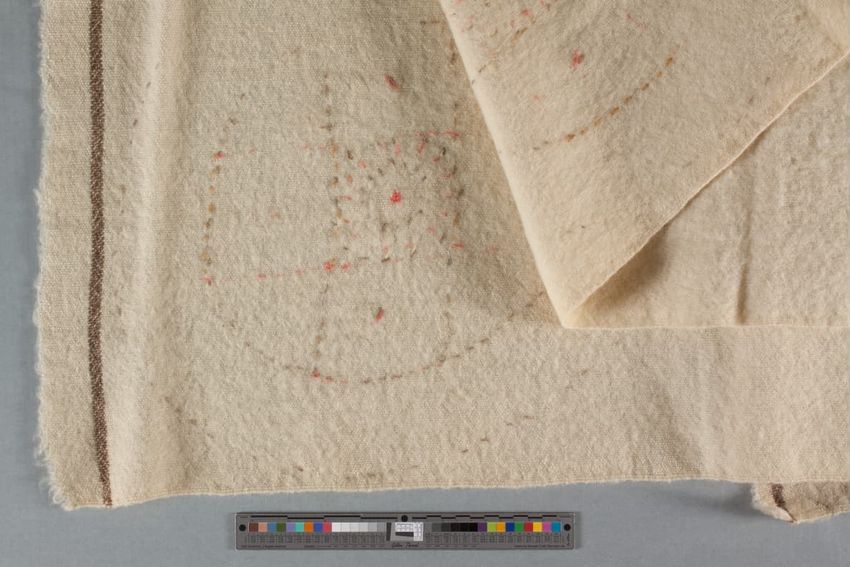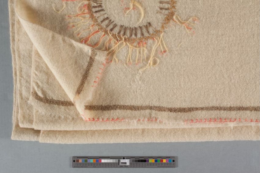 embroidering, weaving, machine-made, piecing, tabby (textile), wool (textile), yarn