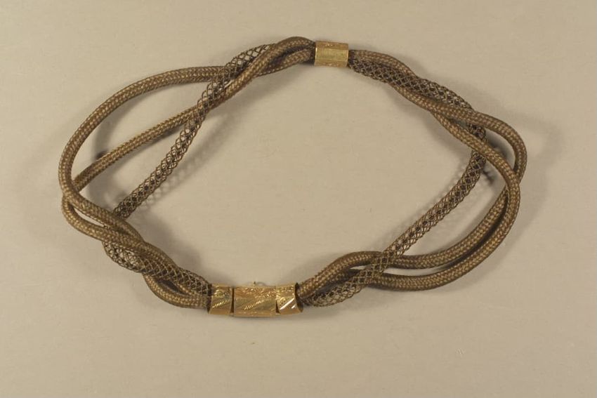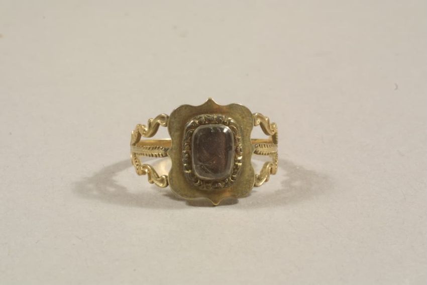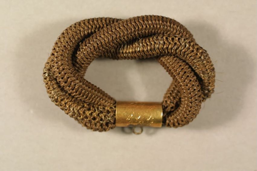 Gold circular pendant, center set with palette worked curls, pearls and pieces of gold wire over a milk glass background, reverse has small compartment set with gold initials "JG" over brown hair in basket weave pattern, gold loop on top for attachment. White paper box with red edges and pink-tinted...
