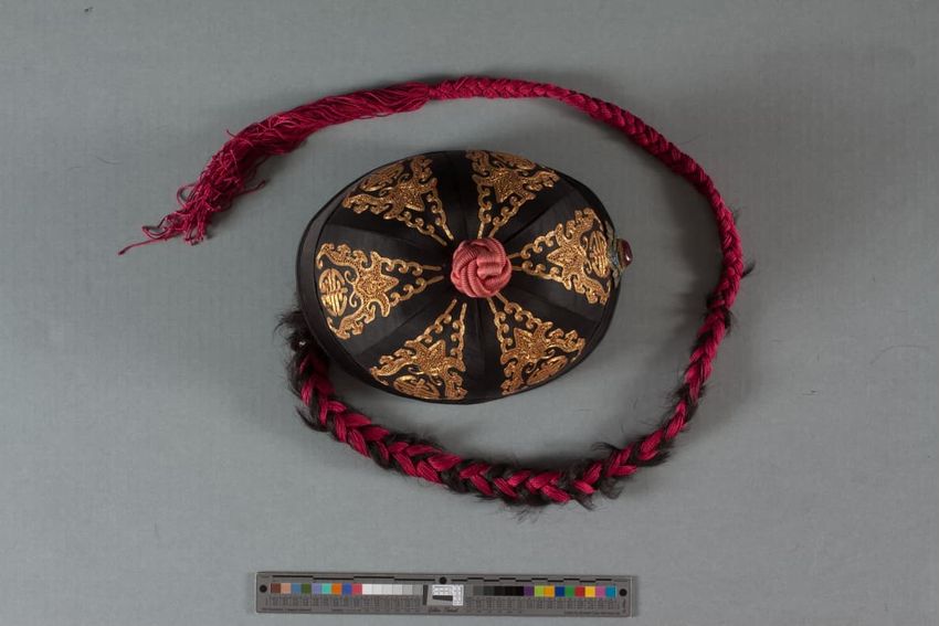 Printed silk chiffon; pastel paisley border, with satin stripes, in pinks, blues and greens; cream center, scrolling meander with narrower border of "patchwork" pattern, ends are cream with row of faggoting.