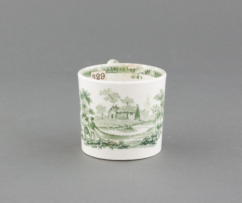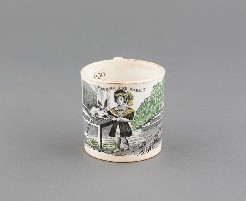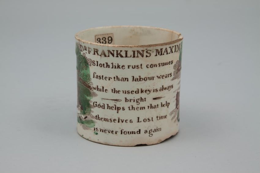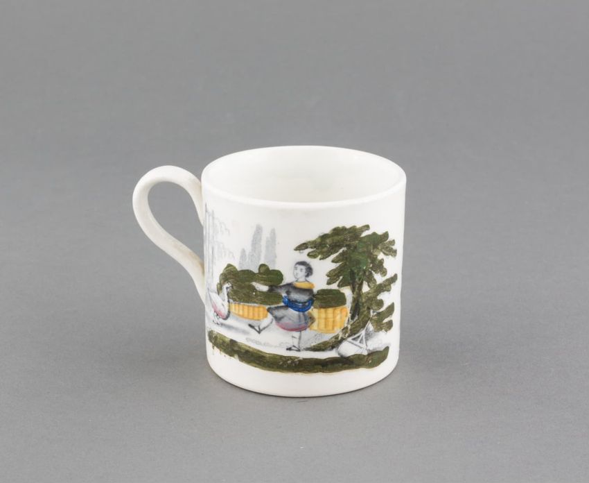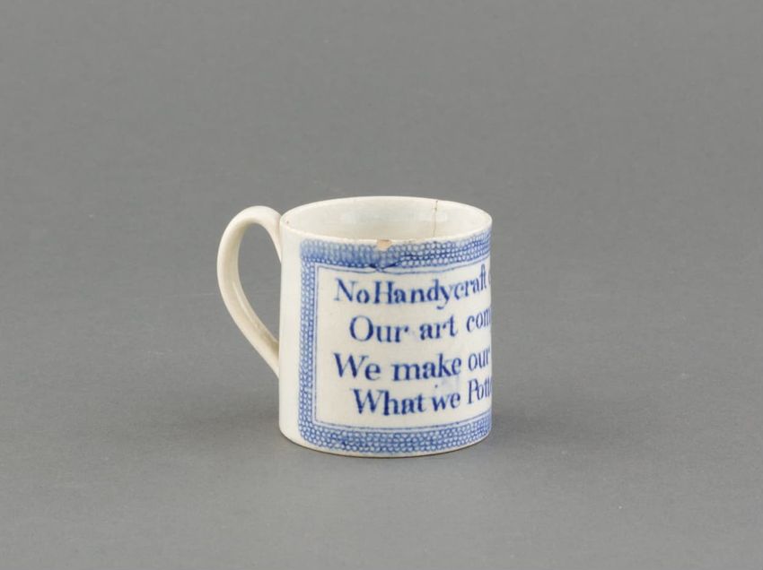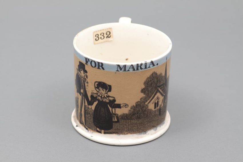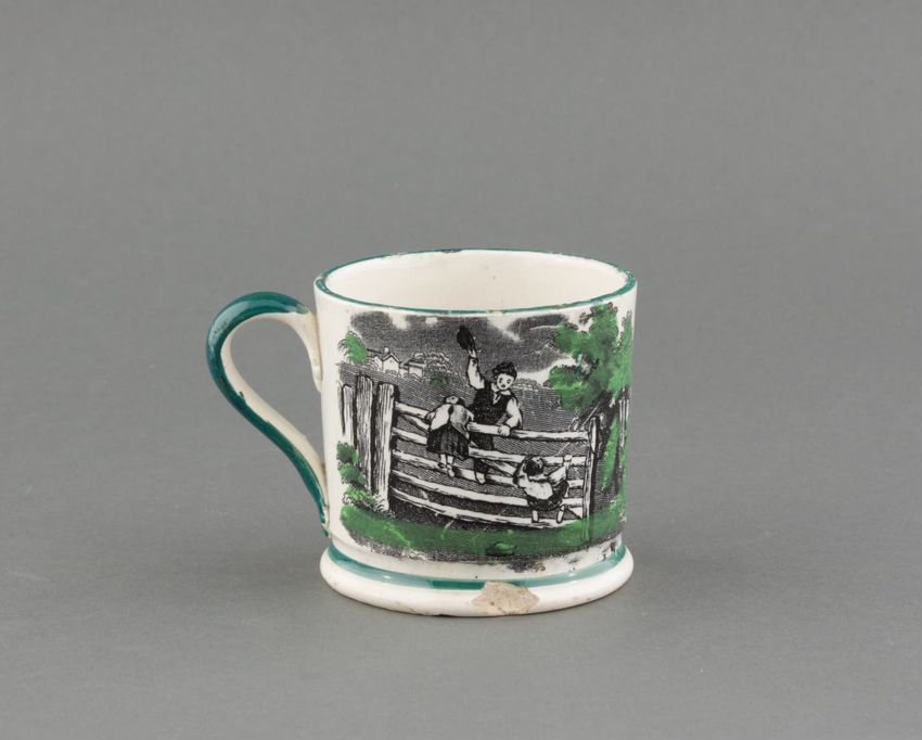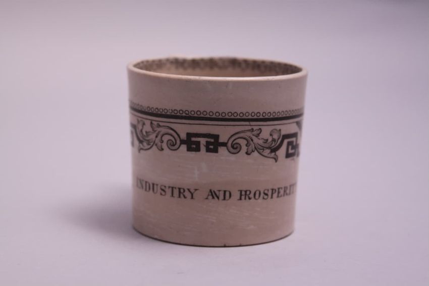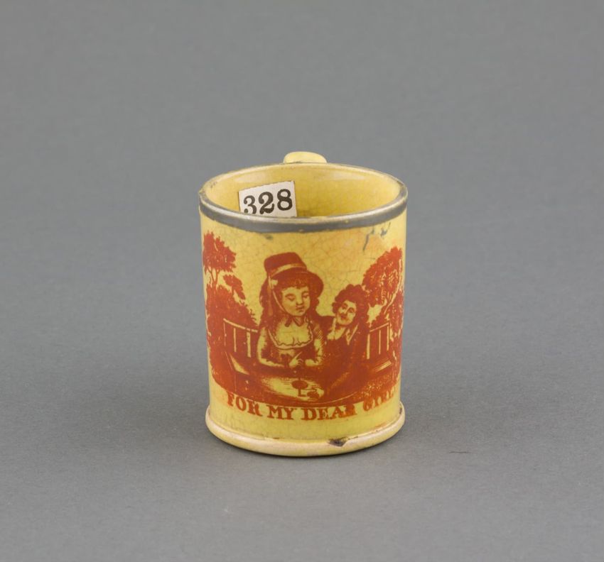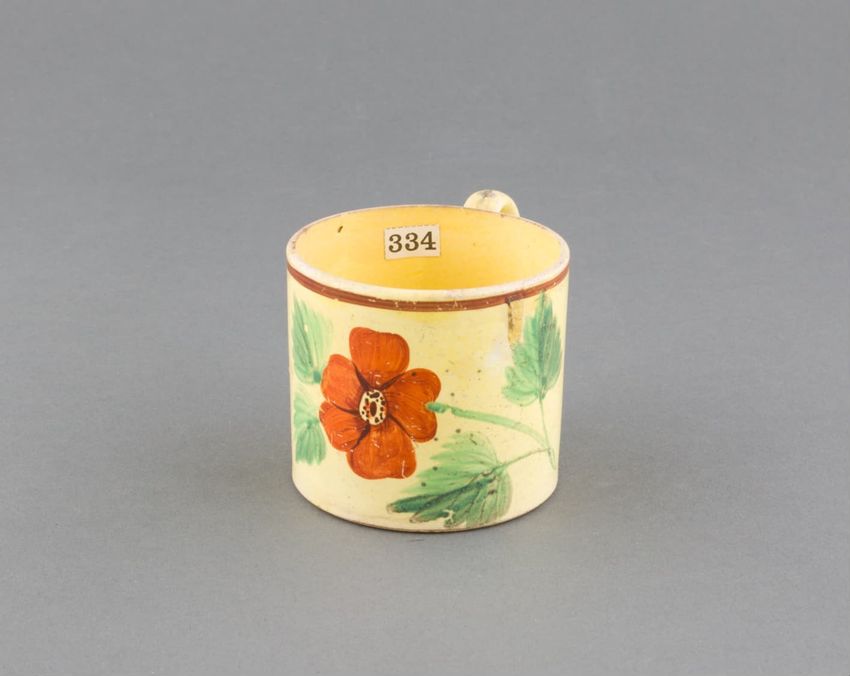 Lusterware mug. Concave body, shaped and beaded base, and spurred loop handle. Copper luster body with mustard orange band around middle and applied floral decoration, overpainted with red, purple, green, blue, and yellow. Inside of mug is beige with pink luster band at rim.
