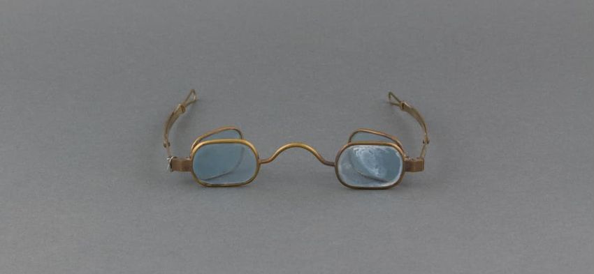 Metal spectacles. Blue tinted oblong Richardson lenses with a crank bridge. Pin-in-slot side arms with teardrop finials.