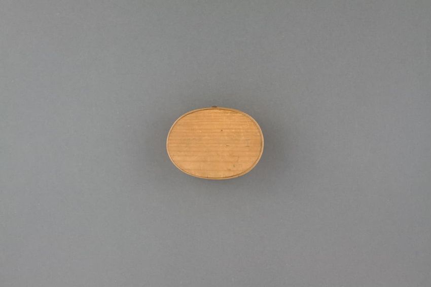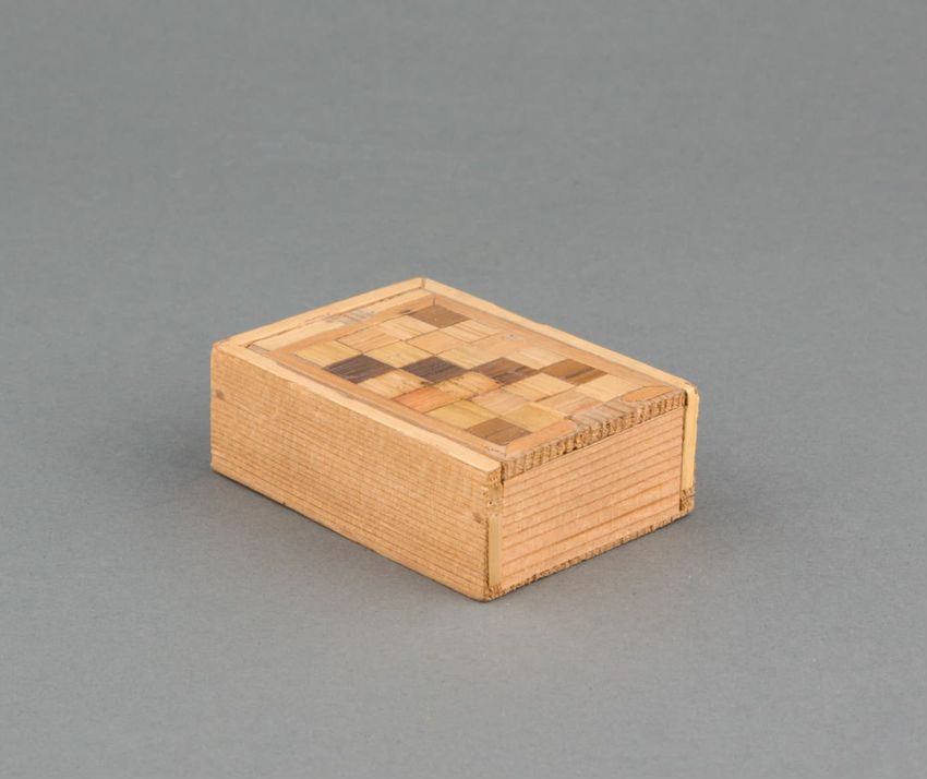 Small box of cedar with straw decoration in checkered pattern on sliding lid. Contents of box: Small paper note with writing in ink: "Mama's old watch and little bit of chain."