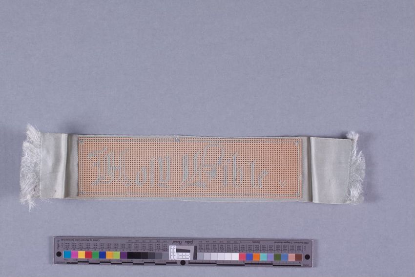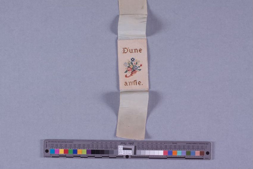 Embroidered perforated card bookmark.