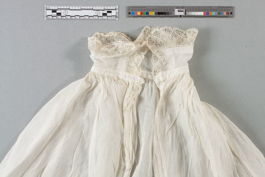 White; fine handkerchief linen; high collar (4 1/2"); front placket with two buttonholes, 1 buttonhole at collar; front placket decorated with stylized floral embroidery; gathered and gusseted sleeves; rounded cuffs with one buttonhole.