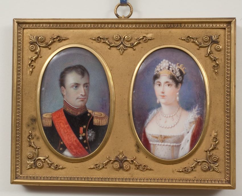 An oil painting of a river scene. Bottom left corner has a small piece of land, and trees line the opposite bank along the horizen line. Two small boats are in the center of the painting, only one of which is occupied. Frame is wood with gilded plaster ornaments, similar to vines and flowers.