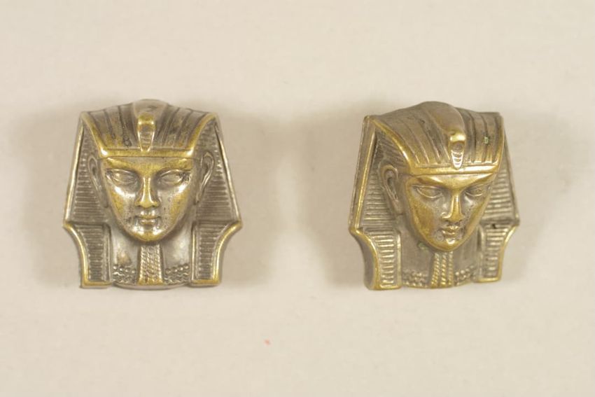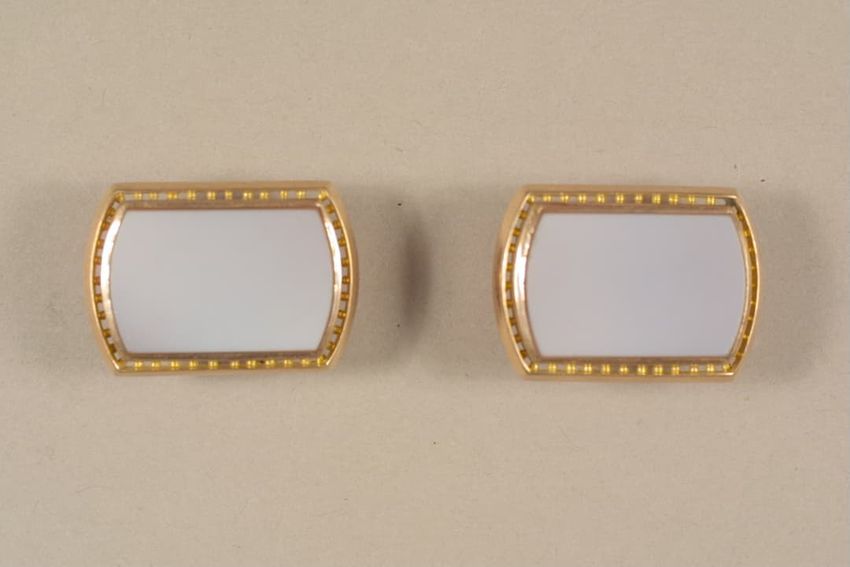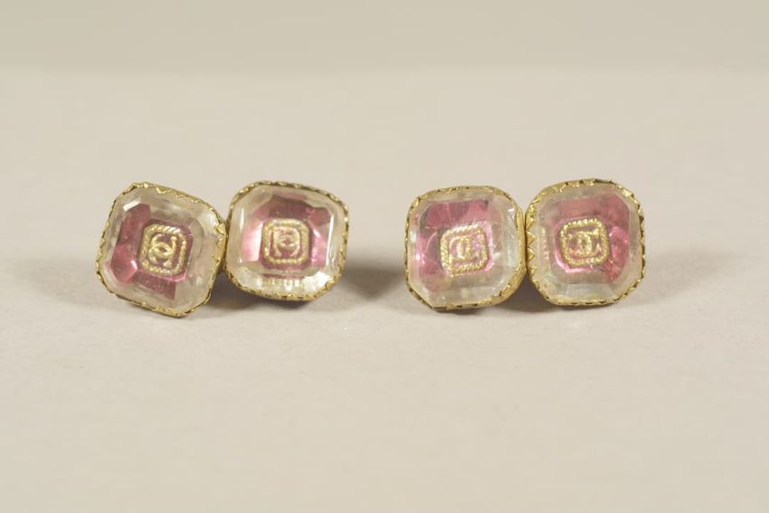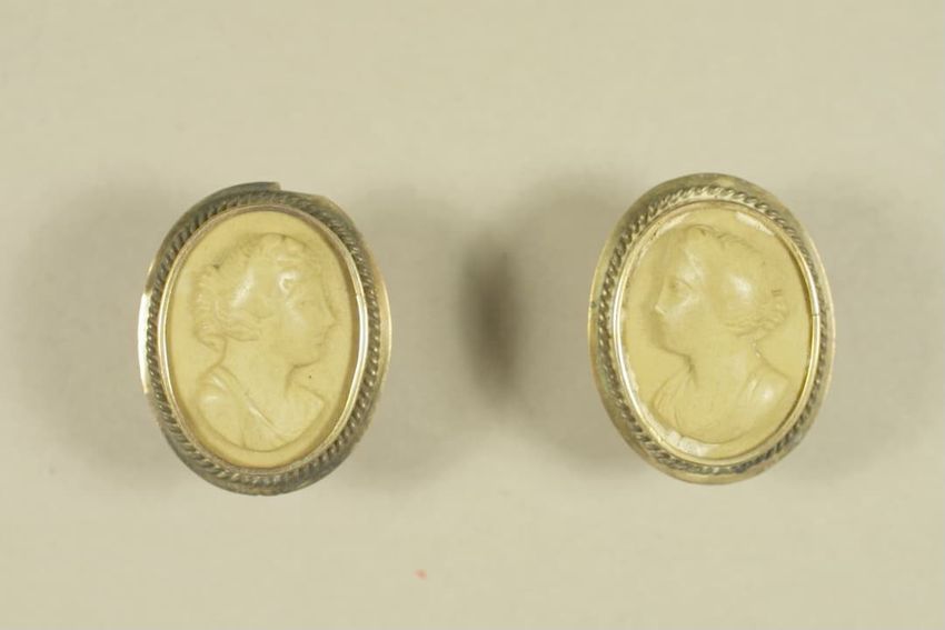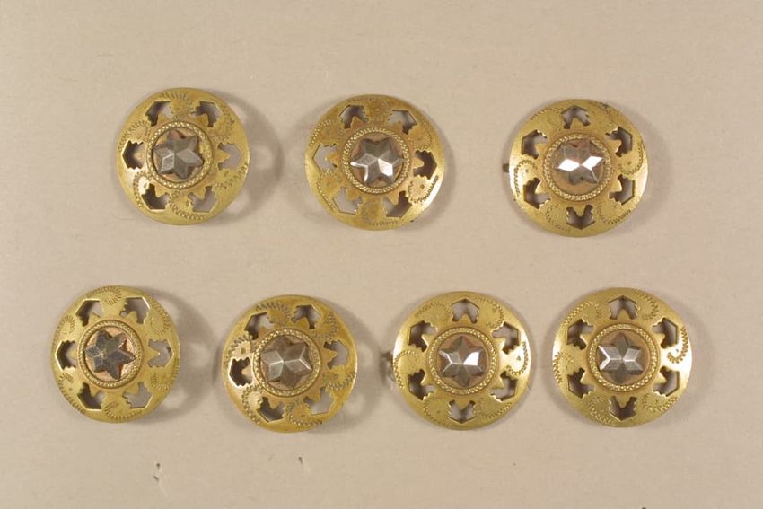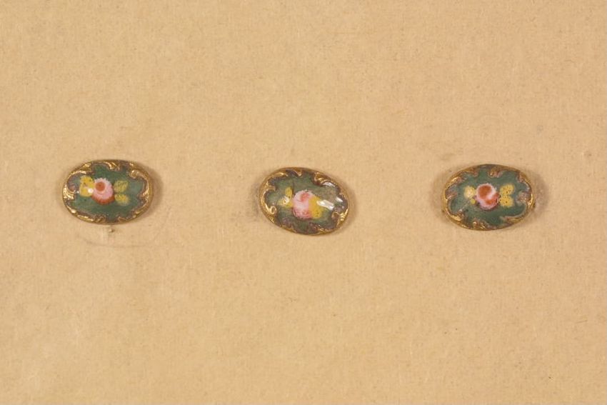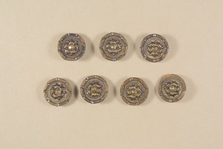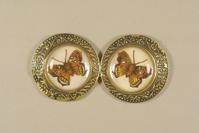 Gilt metal belt buckle consisting of two circular pieces, each feature a painted butterfly on mother of pearl background set under glass, raised scrollwork and beaded border, eye and hook clasp and bars for belt attachment on reverse.