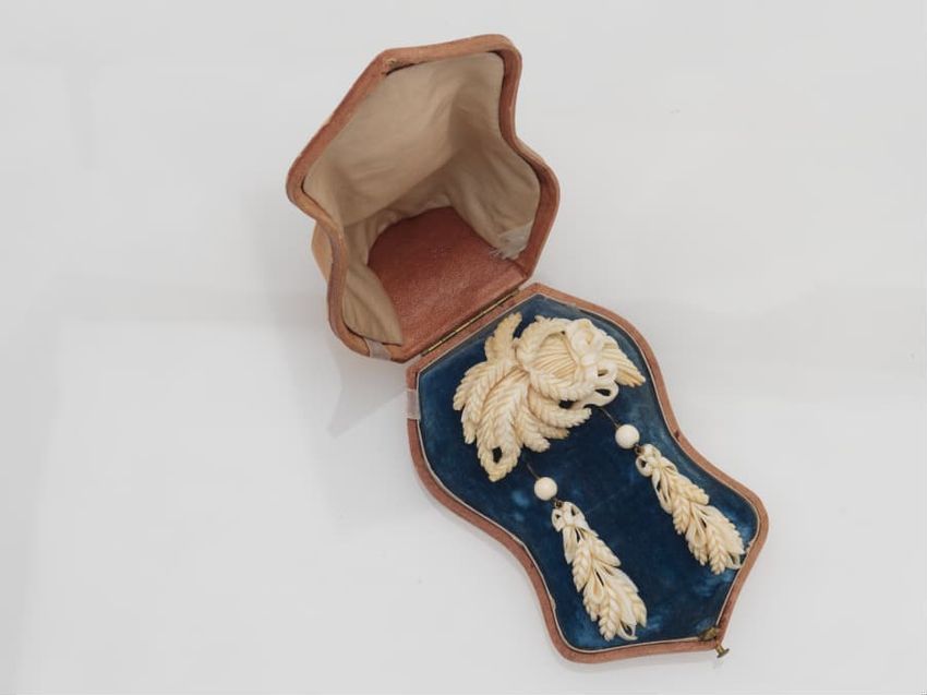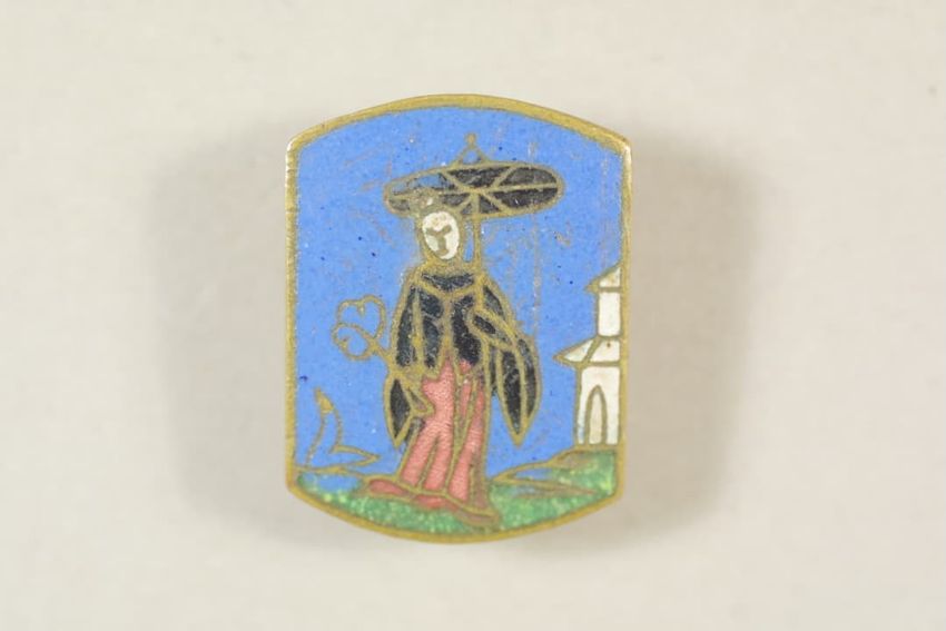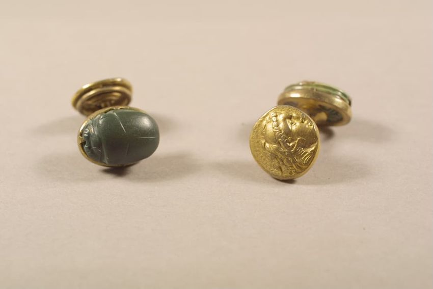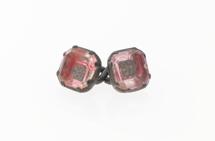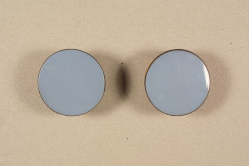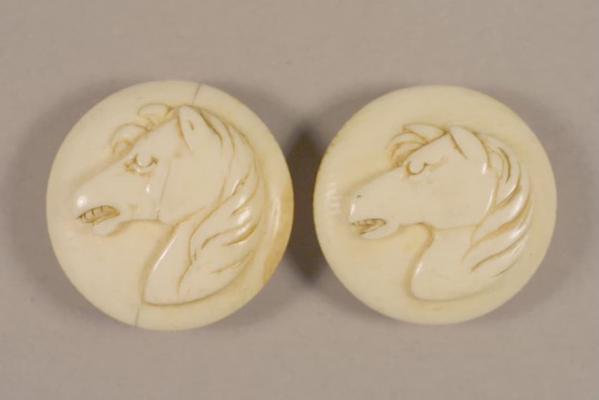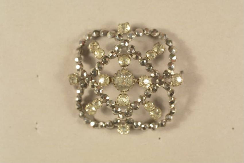 Gilt metal belt buckle consisting of two circular pieces, each feature a painted butterfly on mother of pearl background set under glass, raised scrollwork and beaded border, eye and hook clasp and bars for belt attachment on reverse.