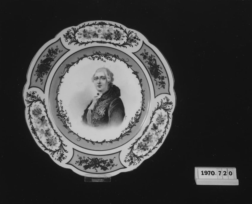 One of a set of two dessert plates with a deep circular well, wide magenta band, and exterior diaper decoration. The central monogram has been replaced with painted strawberries.