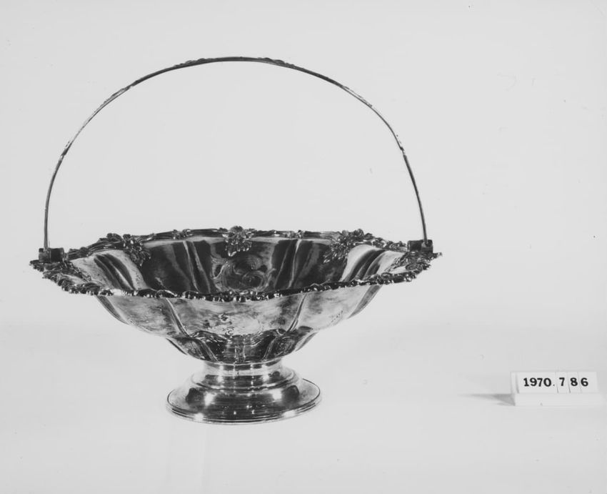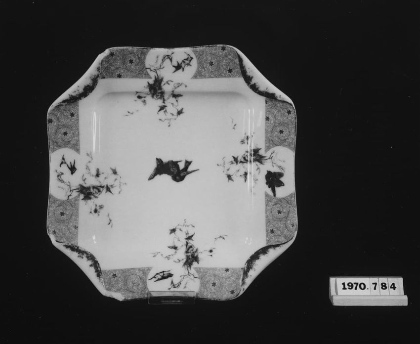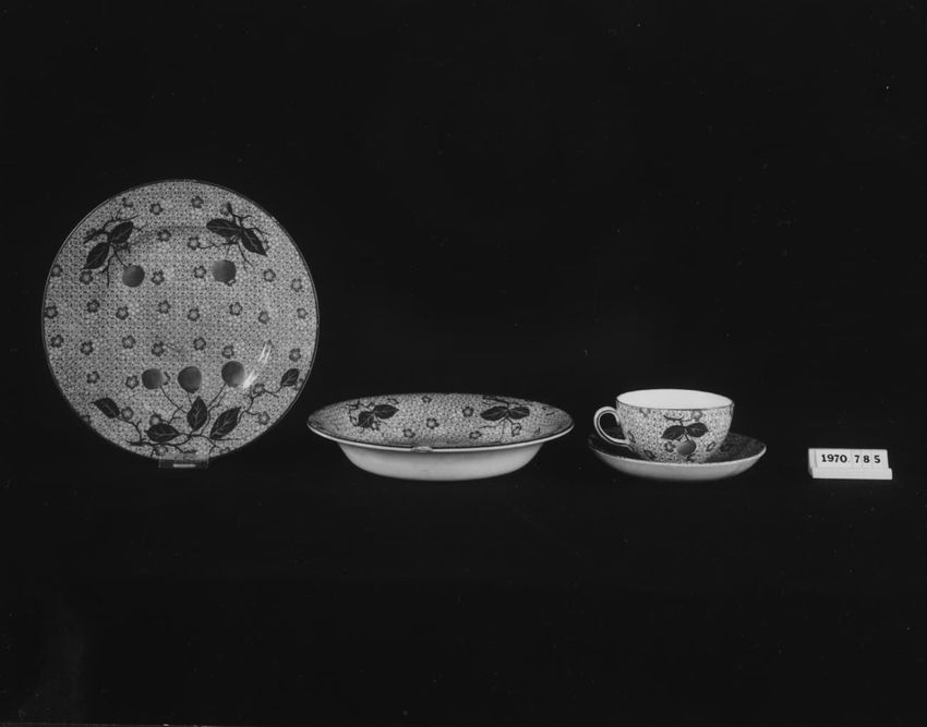 French export porcelain dinner service with pattern of fruit, birds, and diaper and scroll designs around HCB monogr...