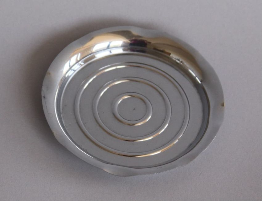 Stained and painted wood; square shaped with rounded corners and handle at one end; green, red, white, yellow, black, strawberry, flower and leaf design painted in center; black dash and dot border; verso is unstained wood.