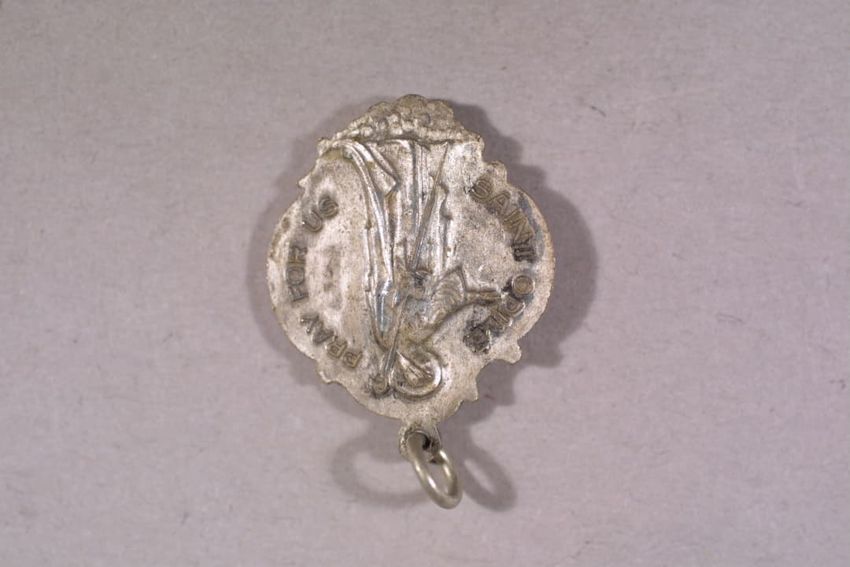 Paper window shade. Exotic and colorful bird is perched on a branch. "Bird of Paradise." Framed by a border of flowers and scrolling foliage. Interlacing detail on the top and bottom of frame. Printed in yellow, purple, red, burgundy, blue, grey, white, brown, caramel on a teal ground. Reverse side ...