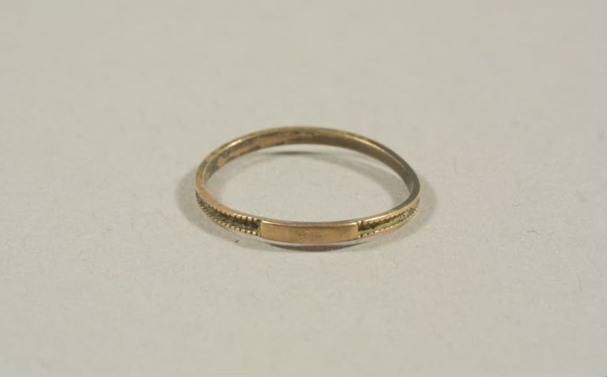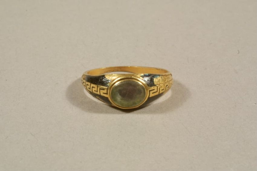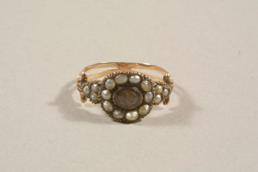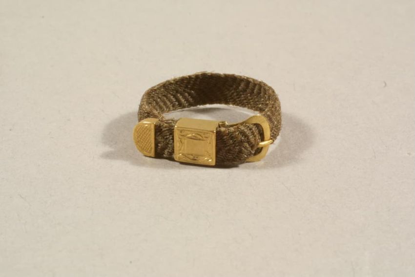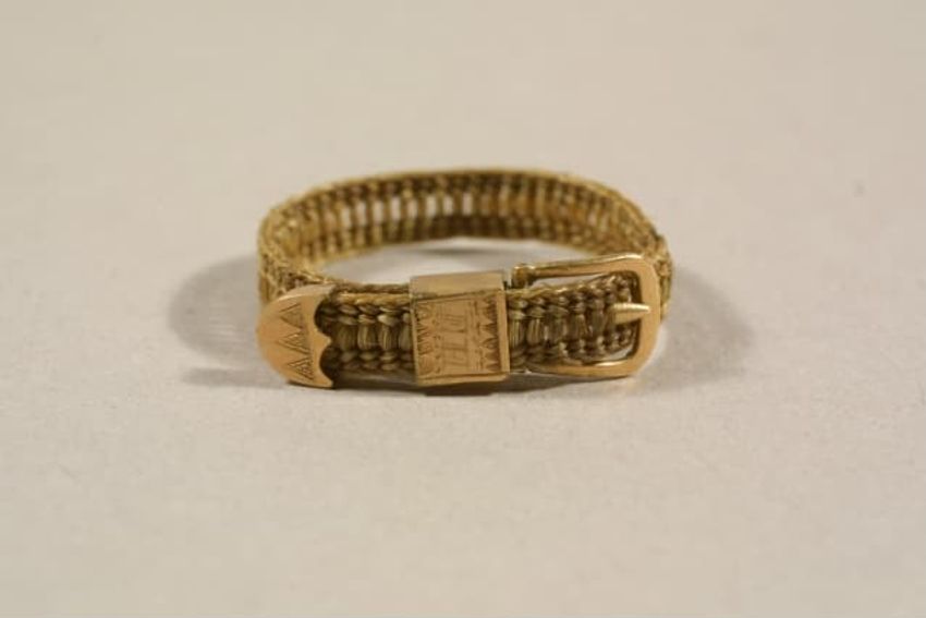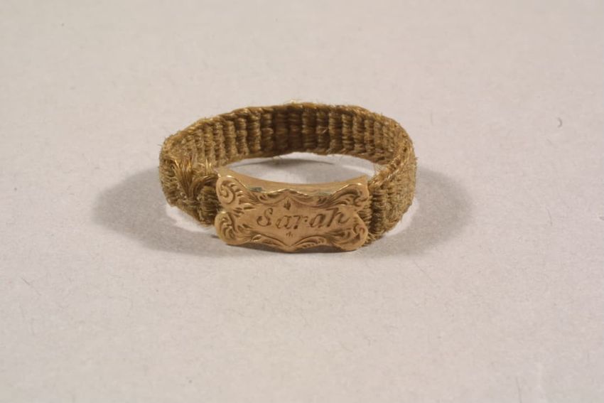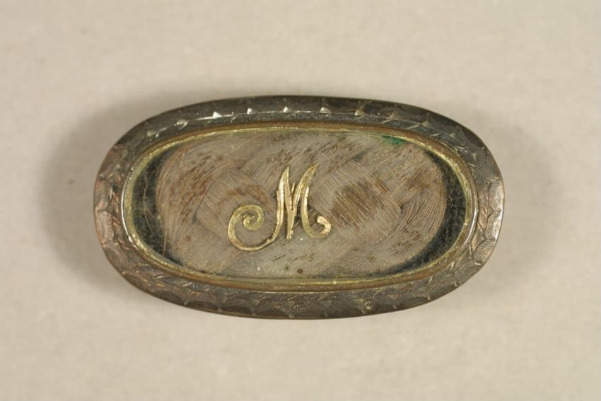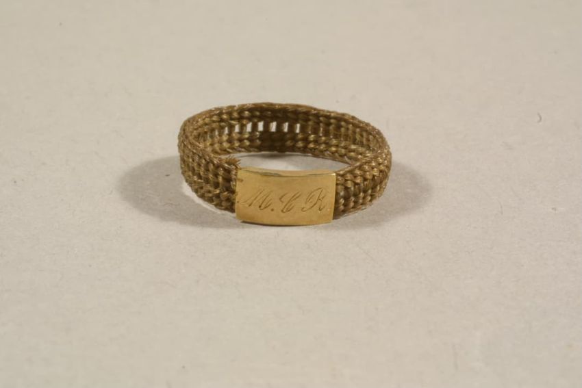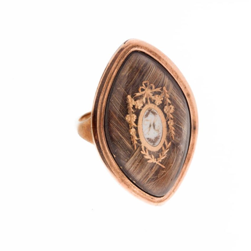 This marquise-shaped ring is set with an ivory oval painted with the letter "H" surrounded by gold foliate swags and bows, all set over woven blonde hair. The shank, shoulders and mount are all plain gold.
