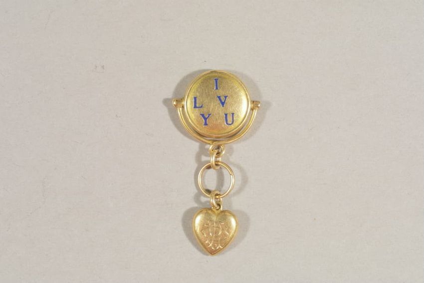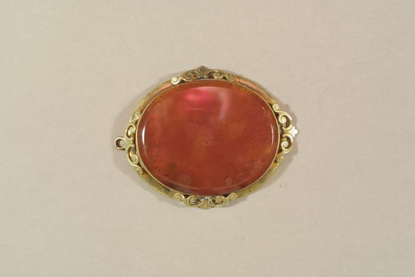 Jewelry set consisting of a pair of bracelets, earrings and brooch all featuring miniatures paintings on ivory set in gold and surrounded by a row of diamonds. One bracelet clasp miniature depicts Joseph Barrell and his wife Sarah and daughter Hannah standing under the word "Enjoyment," the other d...
