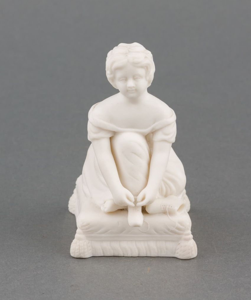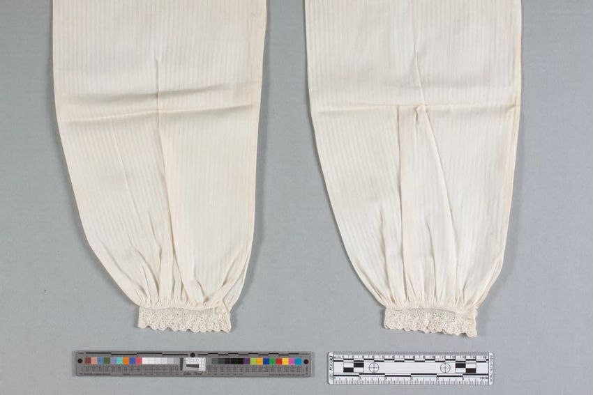 Cream; wool top and bottom; pleated around waist; top stitching along seams; hem embroidered with cream/beige thread with a scalloped edge of curved leaves in two sizes.