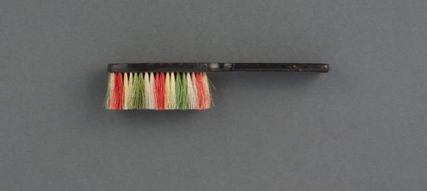 Black moire' ribbed silk shoulder cape; pleated bands of self-fabric around edges; trimmed with black silk braid; long lappets at front; no closure.
