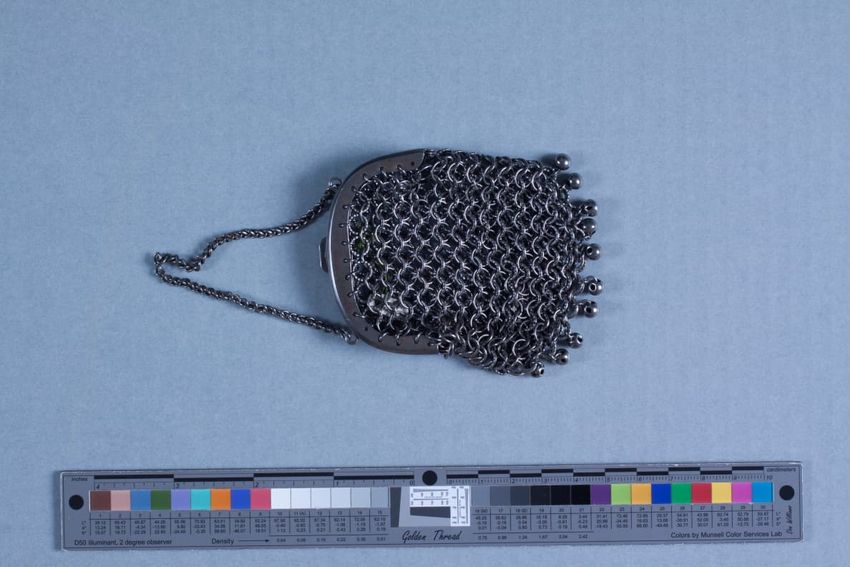 Metal purse with interlocking chains, small metal balls on the bottom and a metal handle.